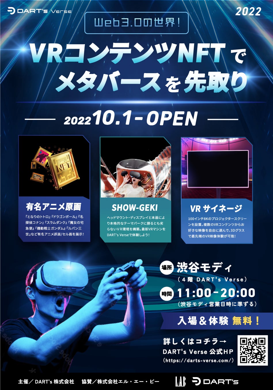 「DART's Verse」(ダーツバース)を運営する(DART’s株式会社、本社:東京都渋谷区、代表取締役社長:杉井靖典)は、株式会社丸井グループ(本社:東京都中野区 / 代表取締役社長:青井浩 / 以下、丸井)が運営する渋谷モディ4Fにて、第3弾イベント「Web3.0の世界!VRコンテンツNFTでメタバースを先取り」を開催します。