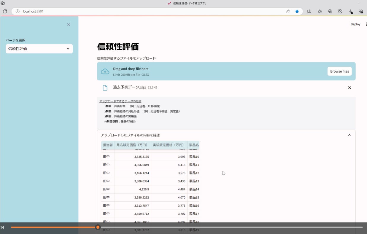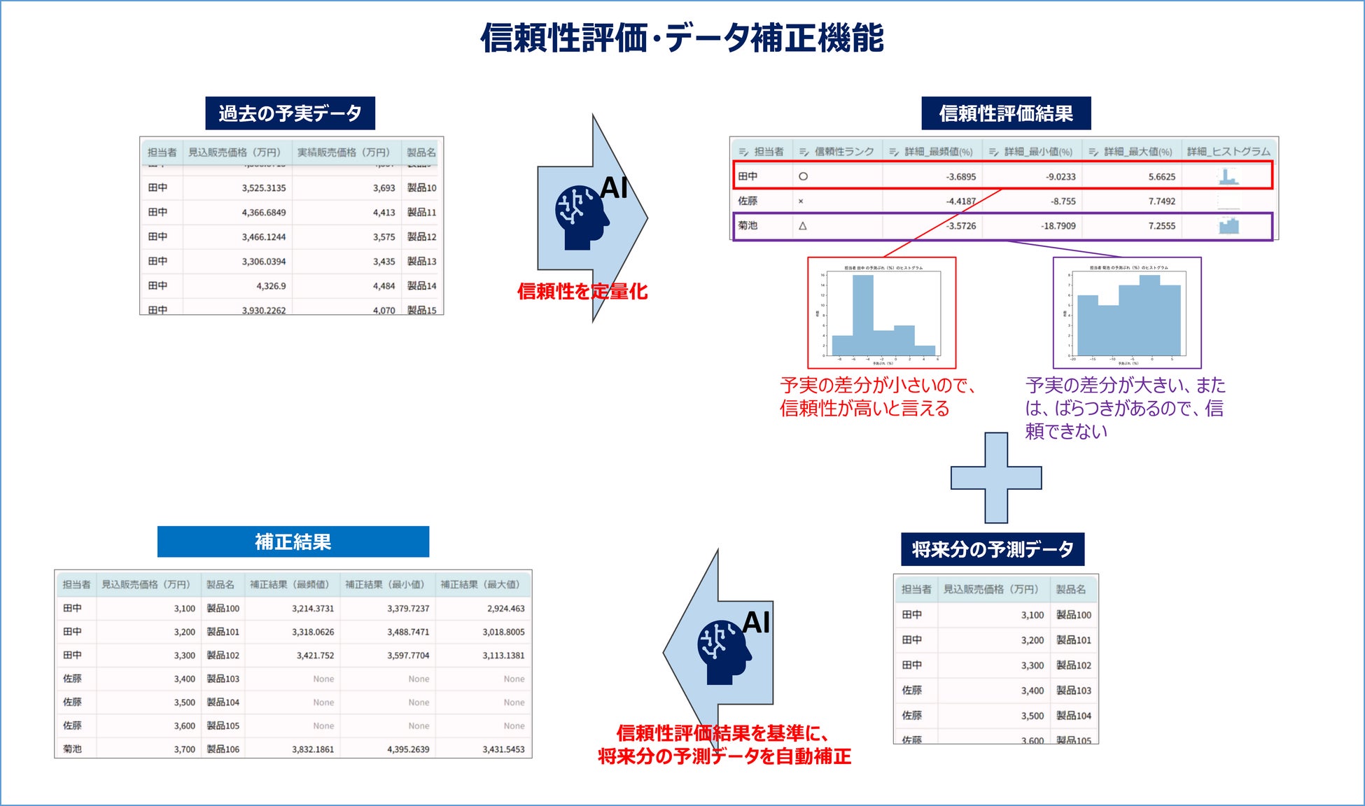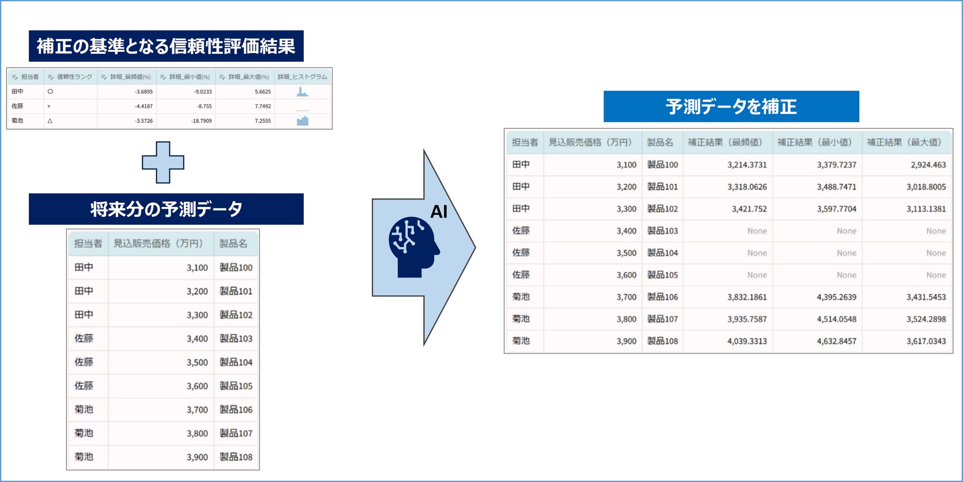 ❷ ❶の信頼性評価結果を基に、将来分の予測データを担当者別の基準で自動補正