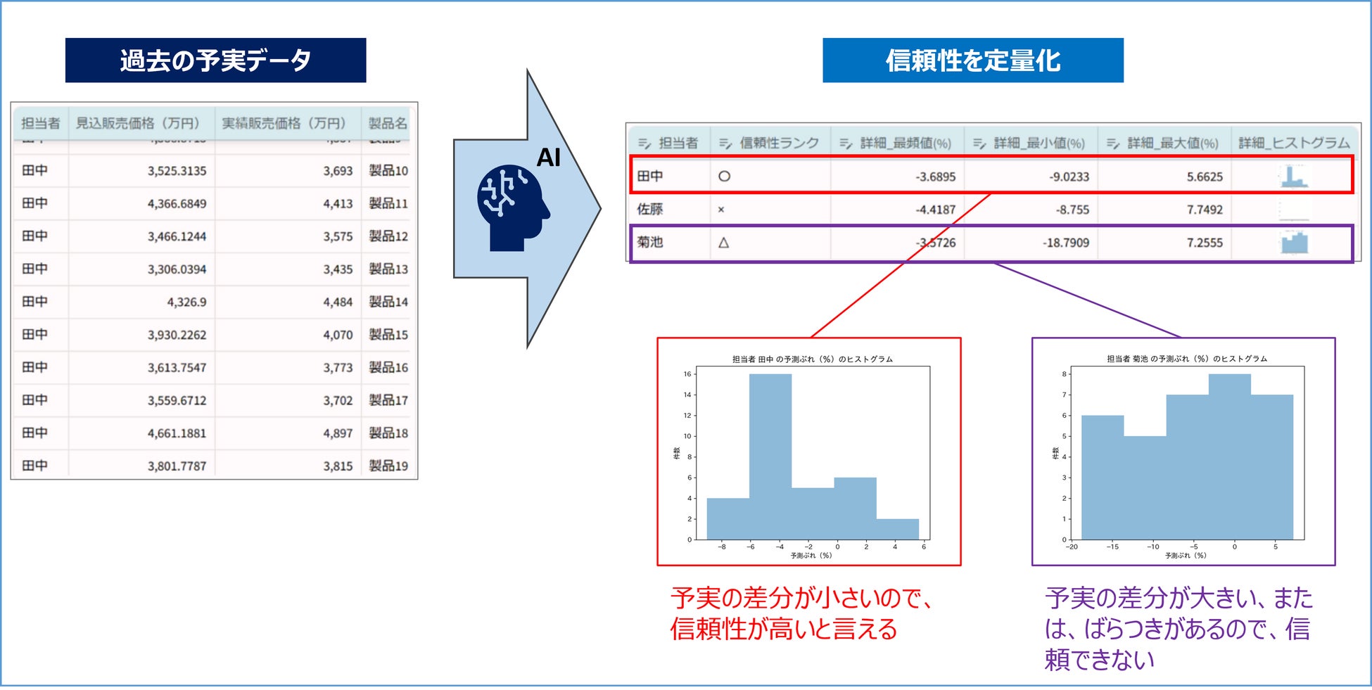 ❶ 過去の予実データを基に担当者別に予測値の正確さを解析することで、各担当者が予測した値に対する信頼性を定量化