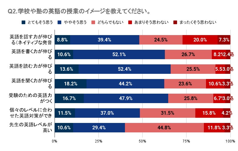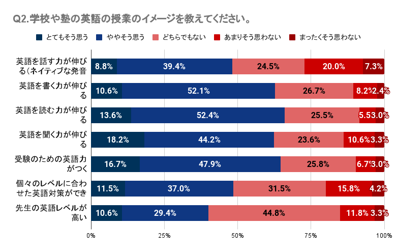 Q1・Q2では、子どもが英会話スクールや英語塾に通っていたが英語力アップの効果を感じていない人が一定数いること、学校や塾の英語の授業に対して明確な効果や良い印象を持てていない人が多いことが明らかになりました。