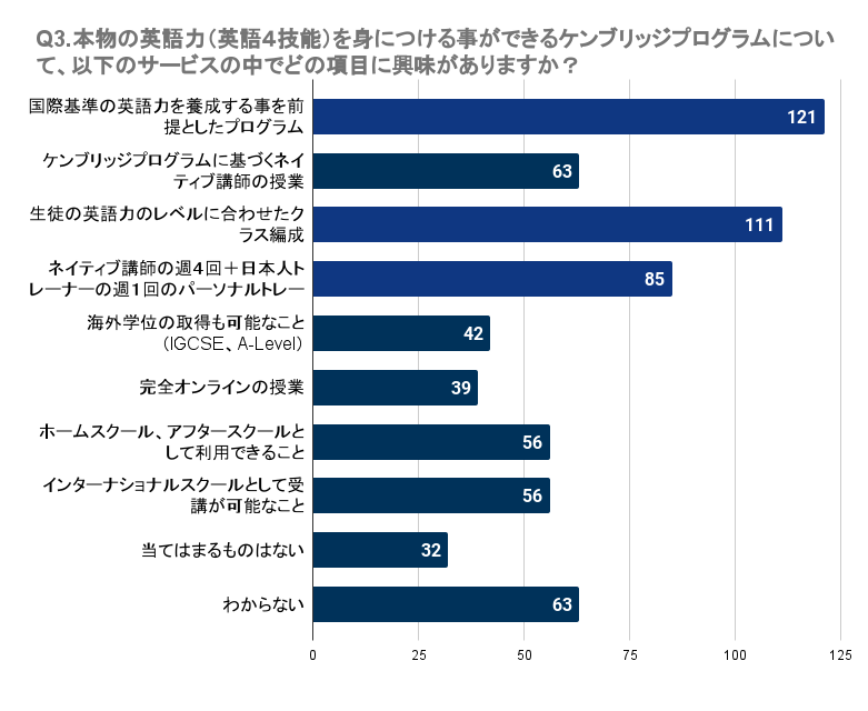 Q3で「本物の英語力(英語4技能)を身につける事ができるケンブリッジプログラムについて、以下のサービスの中でどの項目に興味がありますか?(複数回答可)」と質問したところ、千葉県で最も多かったのは「国際基準の英語力を養成する事を前提としたプログラム」で121名でした。次いで、「生徒の英語力のレベルに合わせたクラス編成」には111名、「ネイティブ講師の週4回+日本人トレーナーの週1回のパーソナルトレーニング」には85名が興味を持っています。一方で、「海外学位の取得も可能なこと(IGCSE、A-Level)」や「完全オンラインの授業」に関心を持つ人はやや少なめで、それぞれ42名、39名の回答でした。これらの結果から、多くの人は実用的な英語力の養成や個別のニーズに応じた指導に重きを置いていることが伺えます。