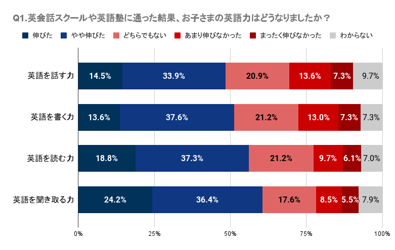 Q1で「英会話スクール、英語塾に通った結果、お子さまの英語力はどうなりましたか?」と質問したところ、千葉県では英会話スクールや塾に通って英語のスキル向上を明確に感じられなかったと感じている人が一定数いることが分かりました。具体的には、英語を話す、書く、読む、聞き取る各スキルにおいて、「伸びた」と感じる人は15%~20%であり、一方で「あまり伸びなかった」や「まったく伸びなかった」と回答した人が合わせて約15%〜20%となっています。特に、「英語を話す力」と「英語を書く力」においては「あまり伸びなかった」と「まったく伸びなかった」の合計が20%を超えています。また、各スキルに関して「どちらでもない」と答えた人も含めると、約30~40%となっており、明確な効果を実感していない人が一定数存在することが伺えます。