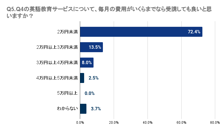 Q4で「受講したい」「料金が安ければ受講したい」「興味がある」と回答した人に、Q5で、「Q4の英語教育サービスについて、毎月の費用がいくらまでなら受講しても良いと思いますか?」と質問したところ、最も多い72.4%の回答者は2万円未満が適切と感じています。13.5%は2万円以上3万円未満、8.0%は3万円以上4万円未満と答えました。対照的に、4万円以上の費用を考える回答者は極少数で、4万円以上5万円未満が2.5%、5万円以上が0.0%でした。これにより、千葉県では多くの人が3万円未満の価格帯を望んでいることが明らかとなりました。