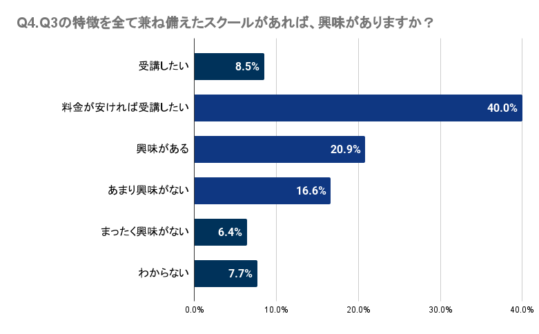 Q4で「Q3の特徴を全て兼ね備えたスクールがあれば、興味がありますか?」と質問したところ、千葉県では8.5%が受講を希望し、40.0%は料金が手頃であれば受講したいと考えています。さらに、20.9%は興味を示していると回答しました。多くの人がこのような特徴を持つスクールに一定の興味を示していることが分かります。
