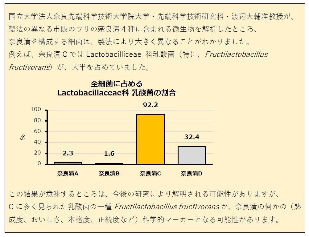 奈良屋本店は、奈良先端科学技術院大学様との共同研究で、当店の奈良漬には、「フルクチバシラス・フルクチボランス」という乳酸菌が非常に多く含まれていることが判明しました。