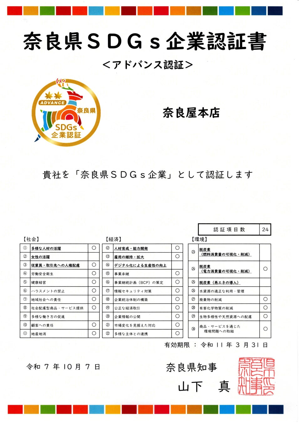認証:奈良県唯一のJAS認定奈良漬メーカー、奈良県SDGsアドバンス認証