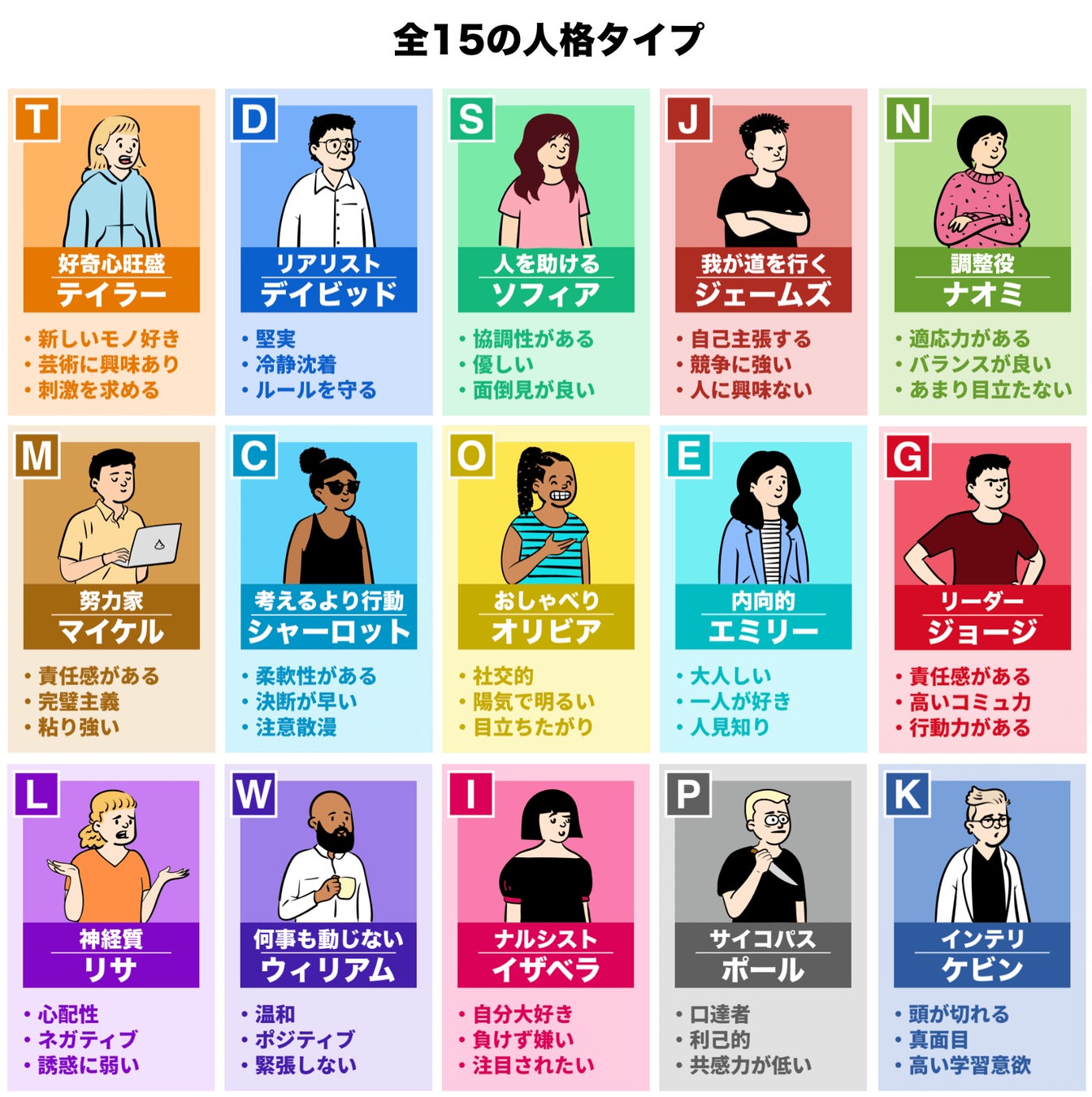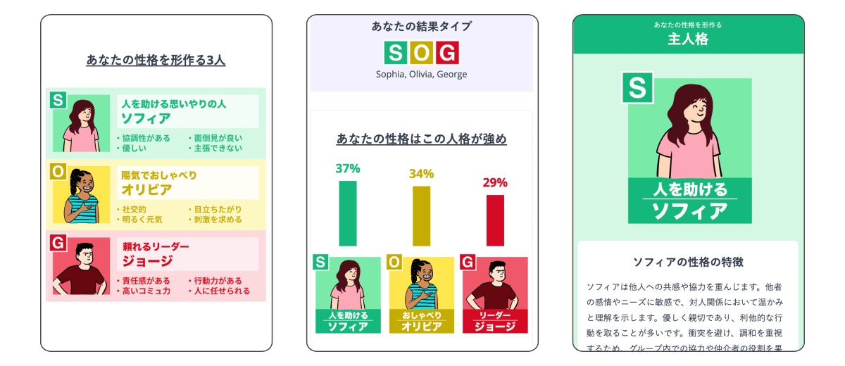診断を受けることで全15の人格のうち診断者の性格を最もよく表している3人の人格が選ばれて結果として提示されます。