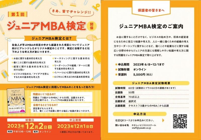 13歳からのMBA【 ジュニアMBA検定(12/2・3)開催 】ビジネスと社会で活きるスキルを中高生向けにアレンジした全く新しい検定をオンラインで開催します。検定に連動した書籍を6月8日(木)発売