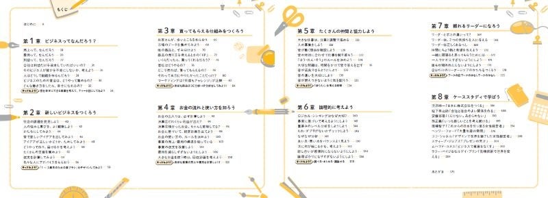 本書では、お金に関することだけでなく、ビジネスの始め方や、将来の経営者になるために役立つ知識や考え方、人と一緒に働くための組織の考え方やリーダーシップに関することなど、働くことや起業などに関する幅広い分野の中から、ジュニアの方達にも理解しやすい知識や考え方を紹介しています。
