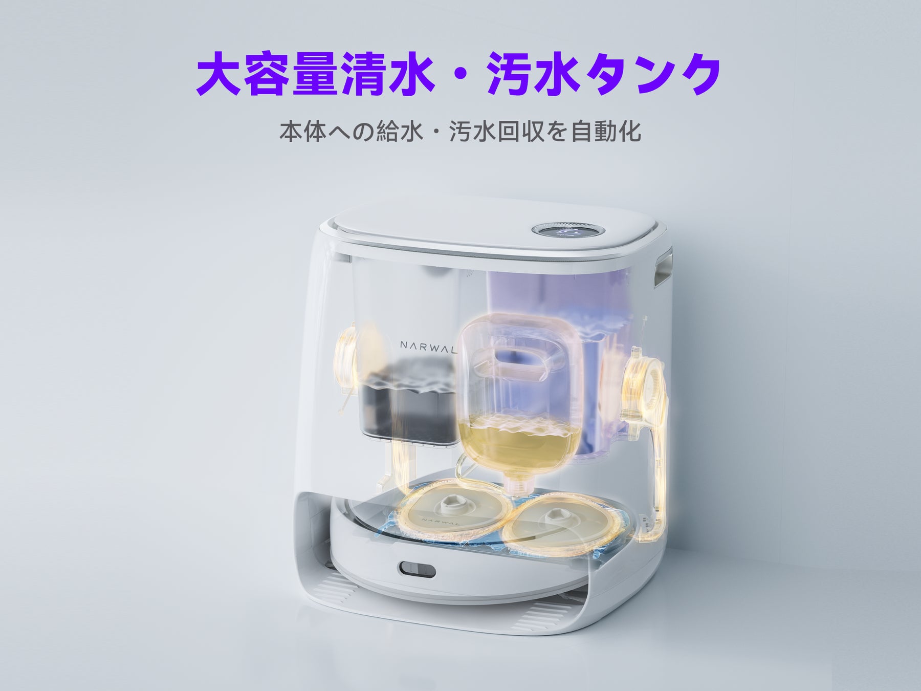 Narwal Freoは、クリーンベース内に大容量の清水・汚水タンクを備えており、水拭き掃除のために必要なロボット掃除機への給水や、掃除が終わった後のロボット掃除機から汚水タンクへの汚水回収も自動で行います。毎回給水・排水を行う必要はありません。