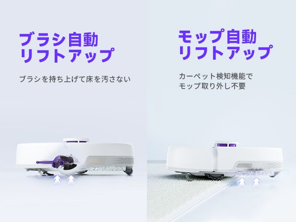 また、毛足の短いカーペットなどに差し掛かると、自動的にモップ部分を持ち上げることで、カーペットを水で濡らしてしまうことを防ぎます。