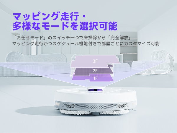 Narwal Freoは、本体上部にあるレーダーで部屋の間取りや家具の配置などを詳細に3Dでマッピングします。詳細かつ複数階にも対応したこの高度なマッピング機能により、全体の掃除ルートの最適化や、個々の部屋を組み合わせたカスタマイズ清掃などを実現しています。さらにスケジューリング機能を活用することで、さまざまな環境で、ベストな清掃作業を自動化することが可能です。