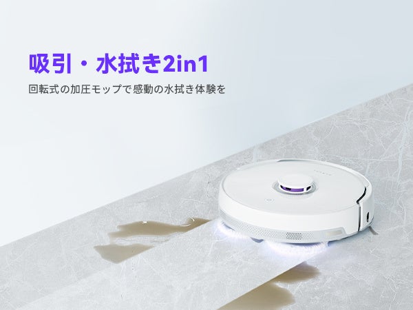 Narwal Freoは、吸引・水拭きに対応した2-in-1タイプのロボット掃除機です。高い吸引力でゴミを収集。水拭きは1分間に180回高速回転する2つの加圧式モップを搭載し、床方向に加圧しながら拭き掃除を行うことにより、床にこぼしてしまったコーヒーから乾いた汚れまできれいに床を磨き上げます。