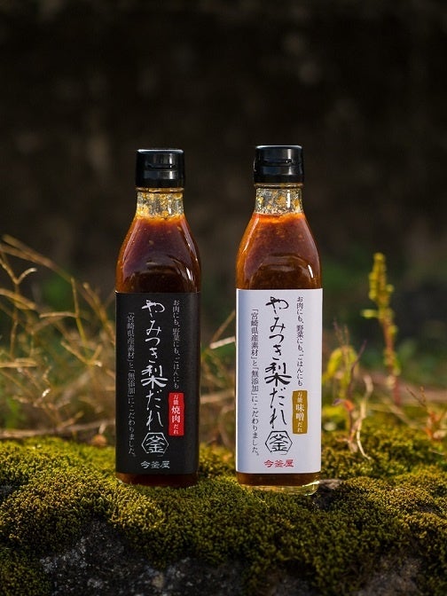 そんな今釜屋で作られるやみつき梨だれは地元小林市の永迫梨園で生産される“運命の梨”との出会いから始まりました。すりおろしリンゴや大根を入れる一般的なタレではなく、永迫梨園の「新高(にいたか)の梨」を主役に、梨の風味を引き立てるよう大豆、塩、小麦だけを使用した醤油、バナナとキウイによる隠し味など、数十種類のすべて無添加な素材をブレンドして作り上げました。