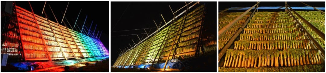 田野・清武地域では、気候風土を最大限に活かし、年間を通じた露地畑作と「干し野菜」の技術を多角的に組み合わせた露地畑作の高度利用システムが令和3年2月「日本農業遺産」に認定されました。その取組の一環として、毎年12月中旬から1月中旬まで、大根やぐらのライトアップが行われています。