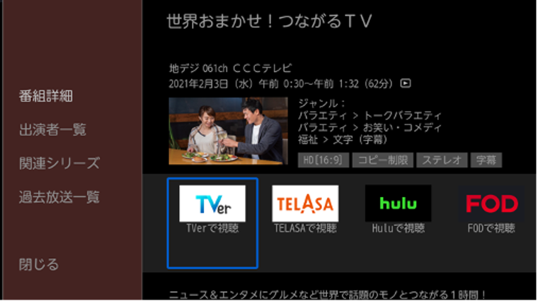 既にスタートしております「TVer」「TELASA」のコンテンツに加え「Hulu」「FOD」のコンテンツがお楽しみ頂けます。