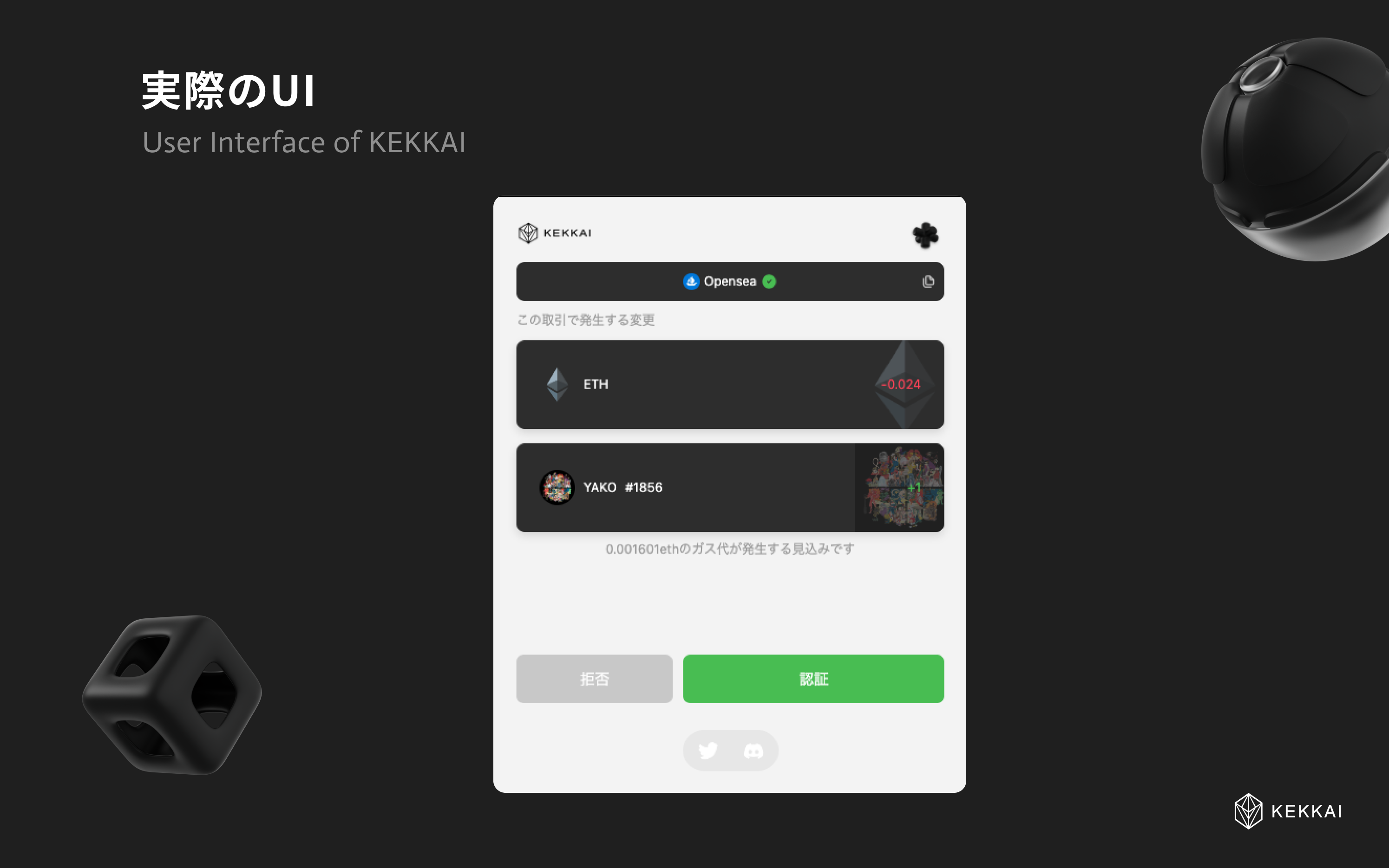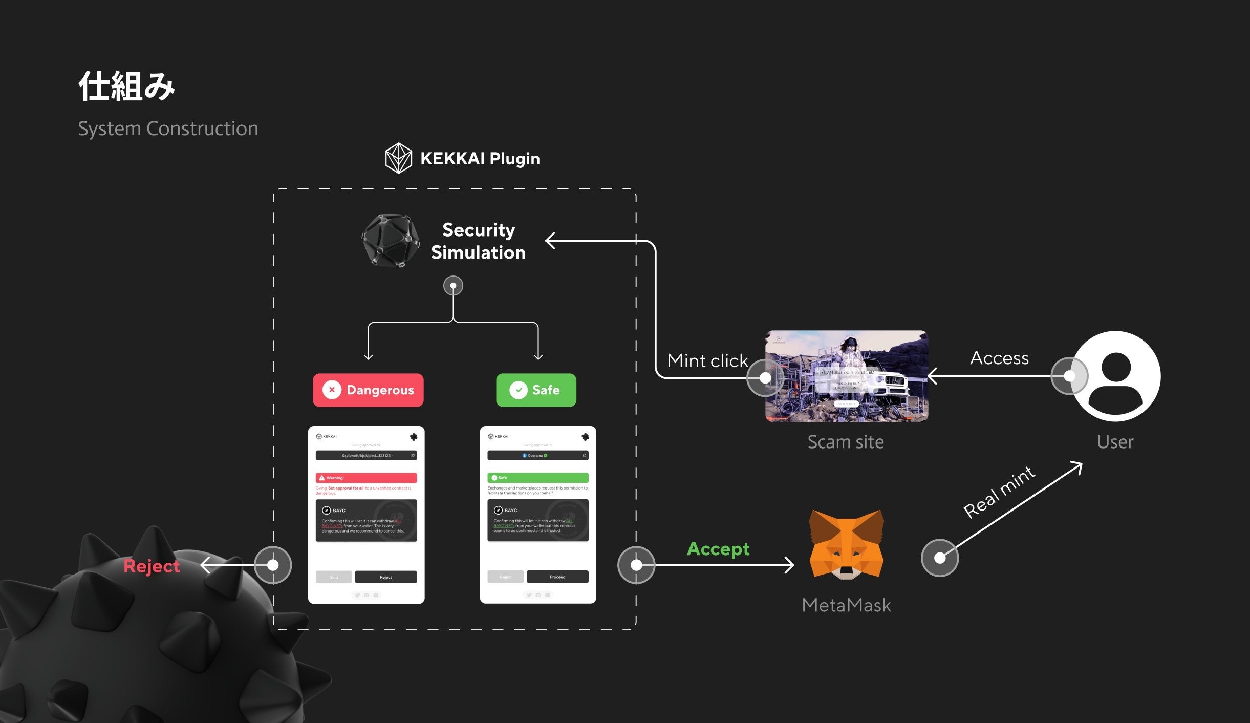 NFTの購入など、ブロックチェーン上でトランザクションが発生するときに、取引をKEKKAIのEVM環境(※)でシミュレーションを行い、その結果を表示します。これによって、既存のウォレットでは把握しにくい取引の内容を明確化することが可能です。