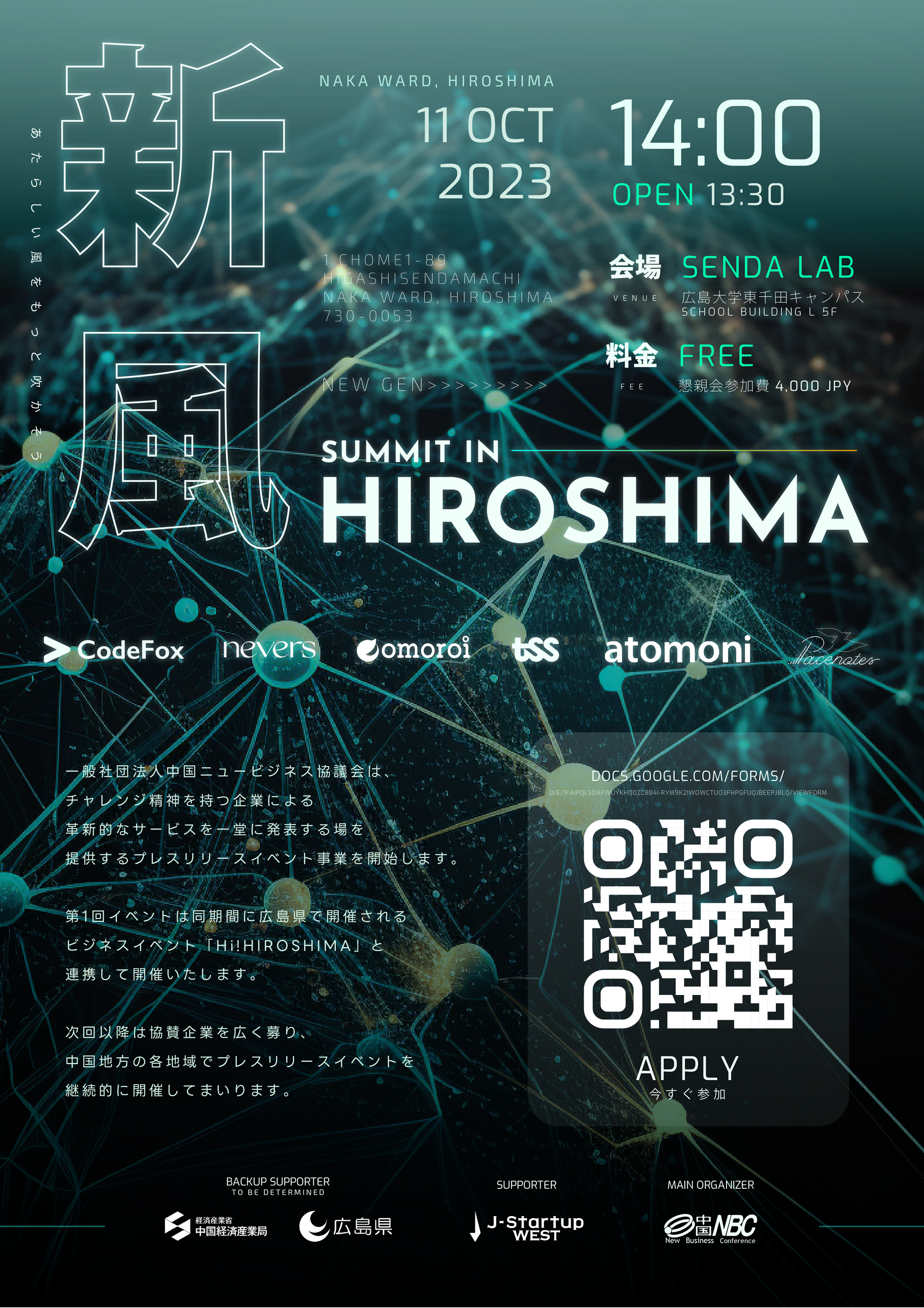 広島県で開催されるビジネスイベント「Hi!HIROSHIMA」と連携し、10月11日開催のイベント「新風 Summit in Hiroshima」にて、SPARKNの機能全貌をご紹介いたします。SPARKN以外にも、その他チャレンジ精神を持つ企業による革新的なサービスも、一堂に発表する場となっております。