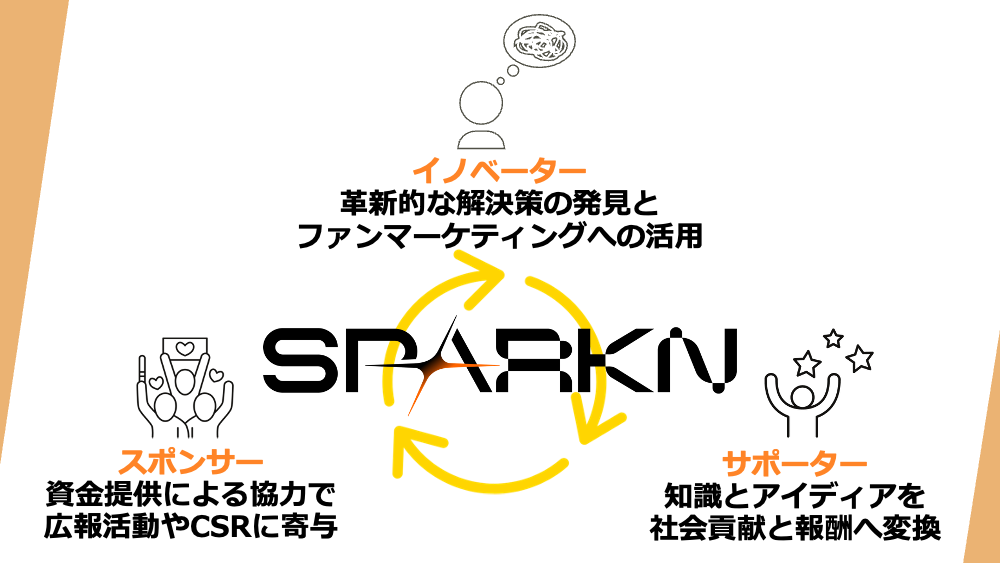 SPARKNは、個人も容易に巻き込み集合知による課題解決を実現する、真のオープンイノベーションを目指して設計されました。イノベーター、サポーター、スポンサーの三者が相互に価値を提供し合うエコシステムを形成しています。これにより、多様なニーズに応える柔軟なプラットフォームとなっています。