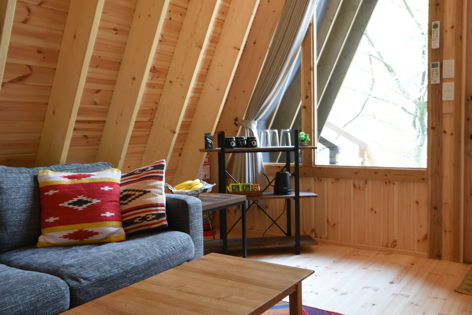 グランピングロッジはAフレームといわれる特殊な三角の形をしたウッドロッジとなっております。Aフレームとは、1960年台から北米を中心に建築されたアルファベットのAの形をした建物です。中でも特徴的なのが正面の壁面が丸ごと窓になっており、部屋の中から大自然を目一杯味わうことができます。
