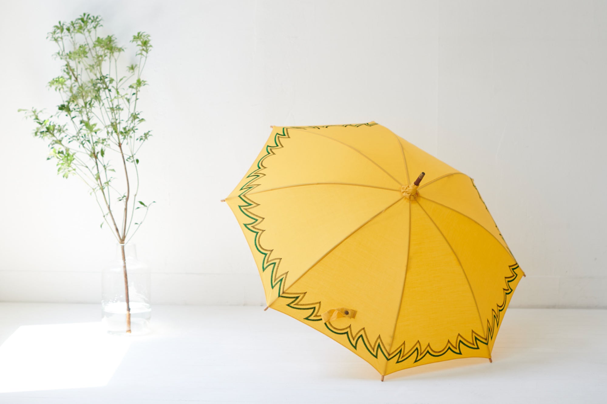 刺繍が印象的な日傘はシンプルな着こなしのアクセントに。