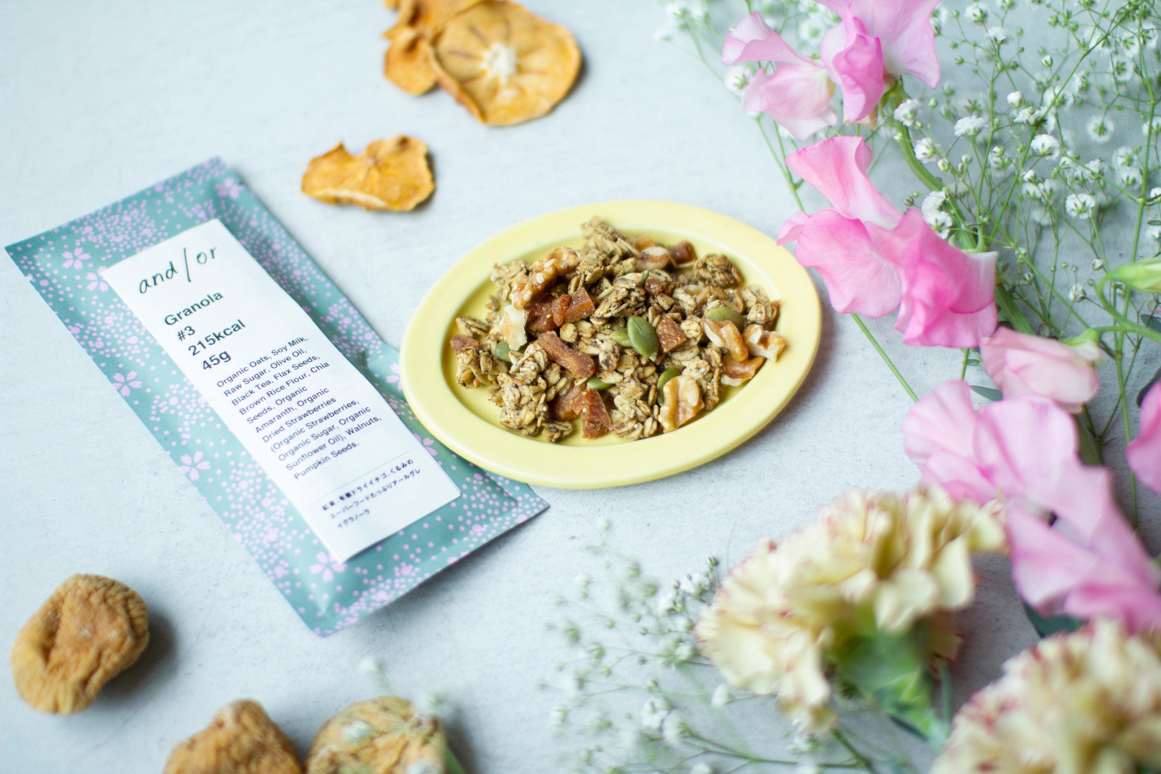 また、この日のために有機JAS認定のオーガニックドライフルーツ2種(有機ドライイチジク/有機ドライ富有柿)をご用意しました。東京・上野公園と谷根千近く”上野桜木”にあるグラノーラ専門店にてお客様にお配りして大好評のオーガニックドライフルーツをセットにしております。有機ドライ富有柿は優しい甘味とコクがあり、有機ドライ白イチジクは柔らかく濃厚な味わいで、女性に嬉しいカルシウム、食物繊維等が含まれています。