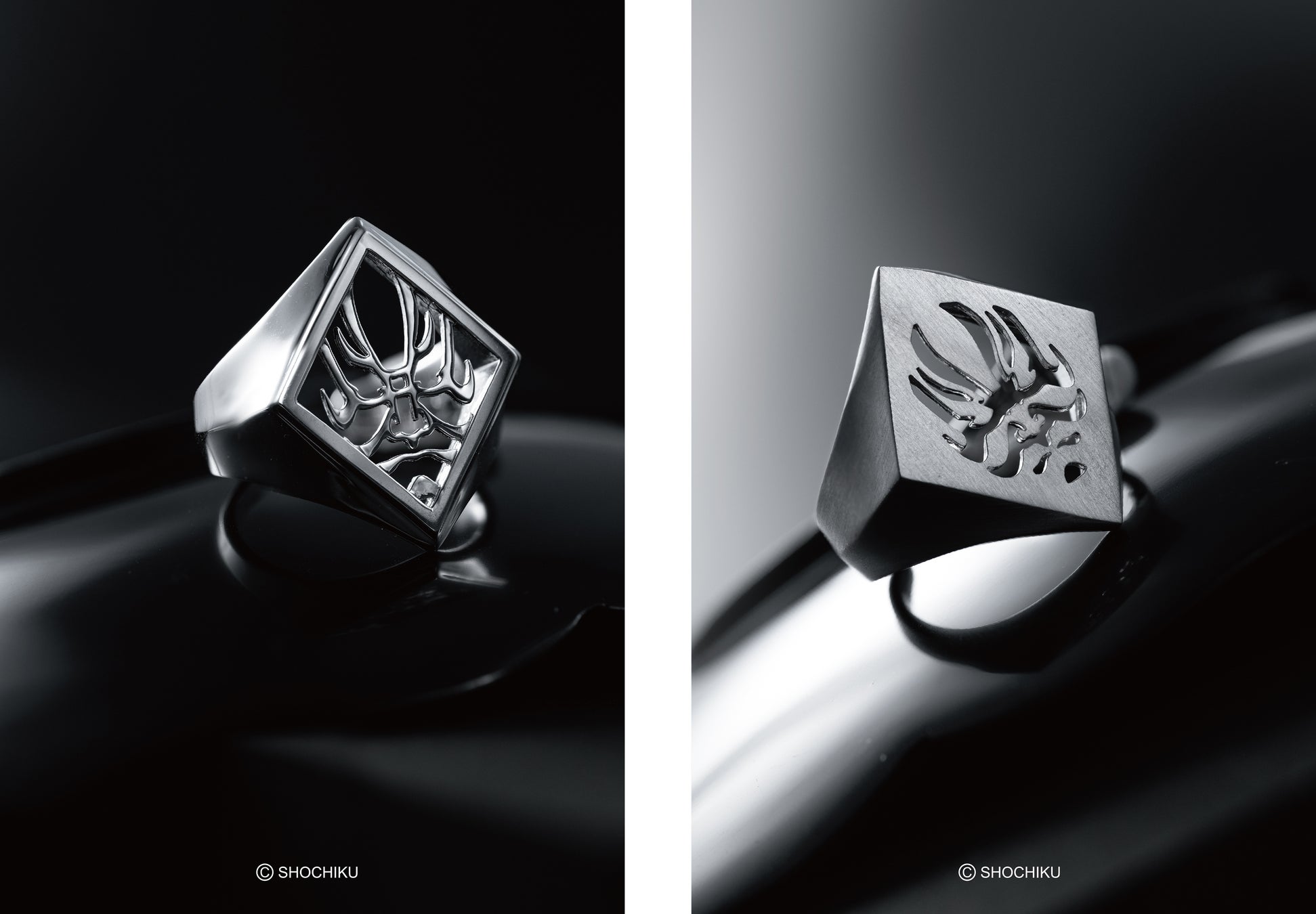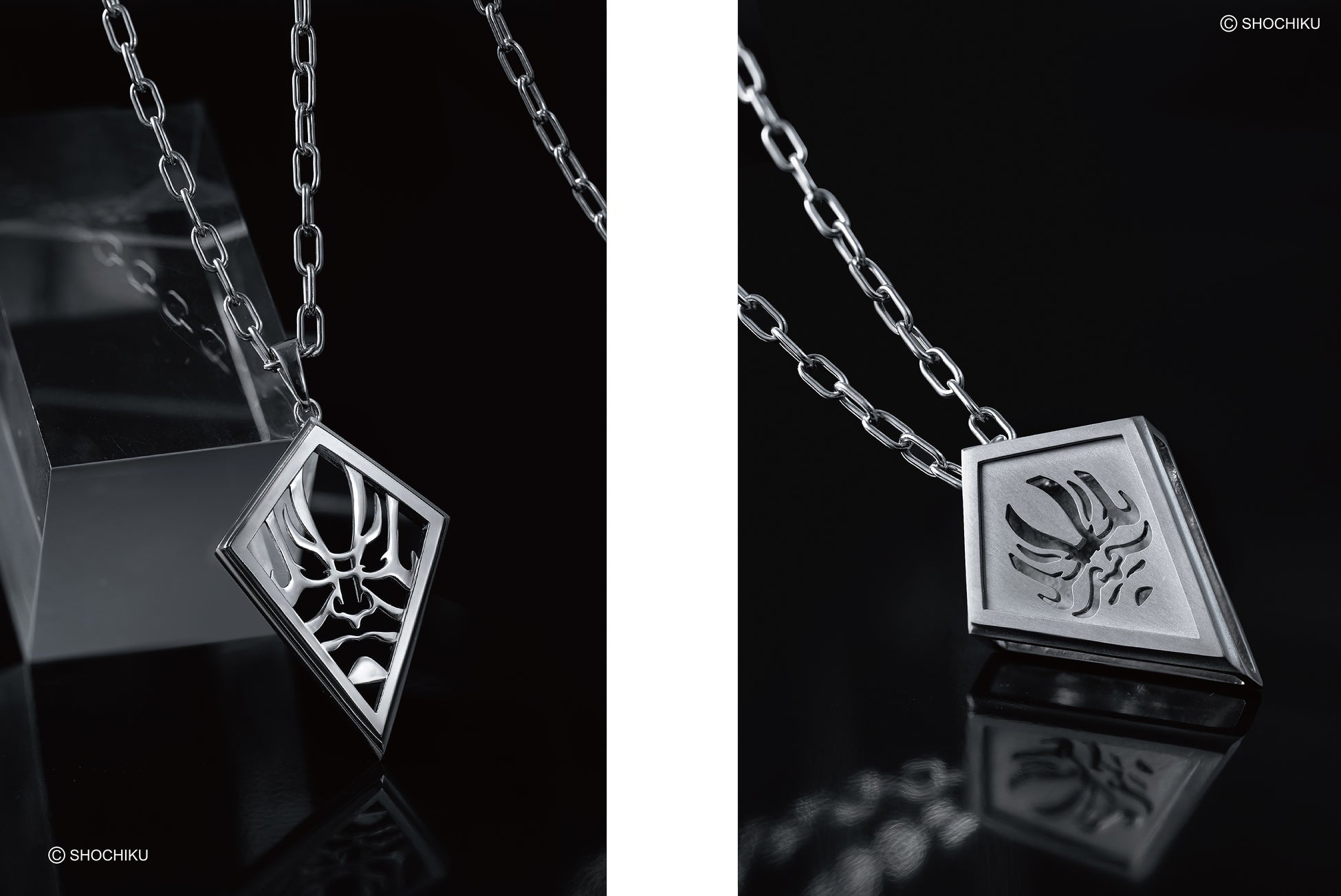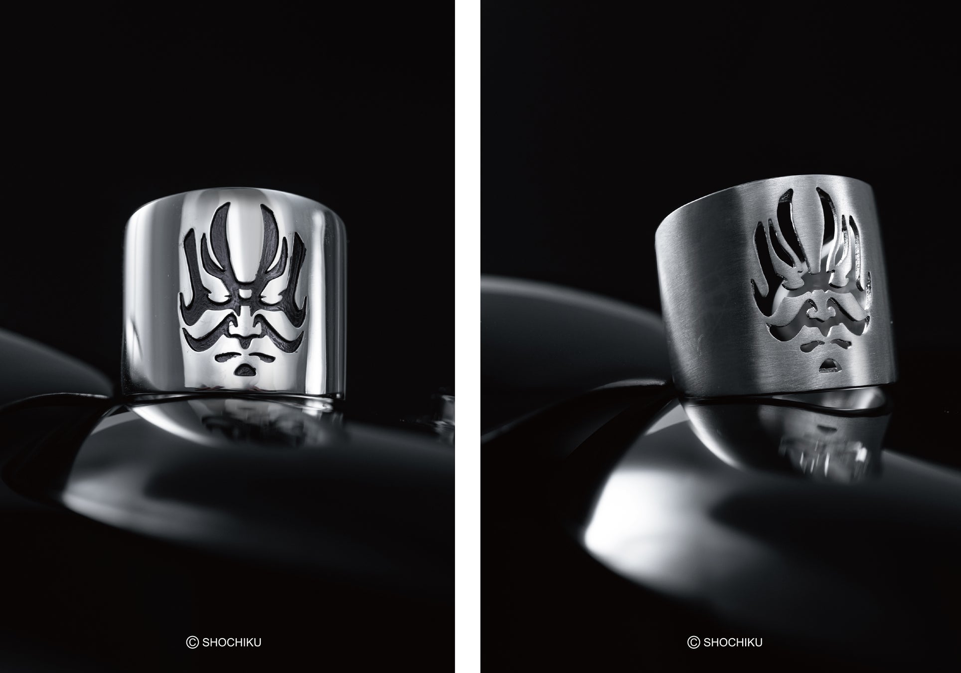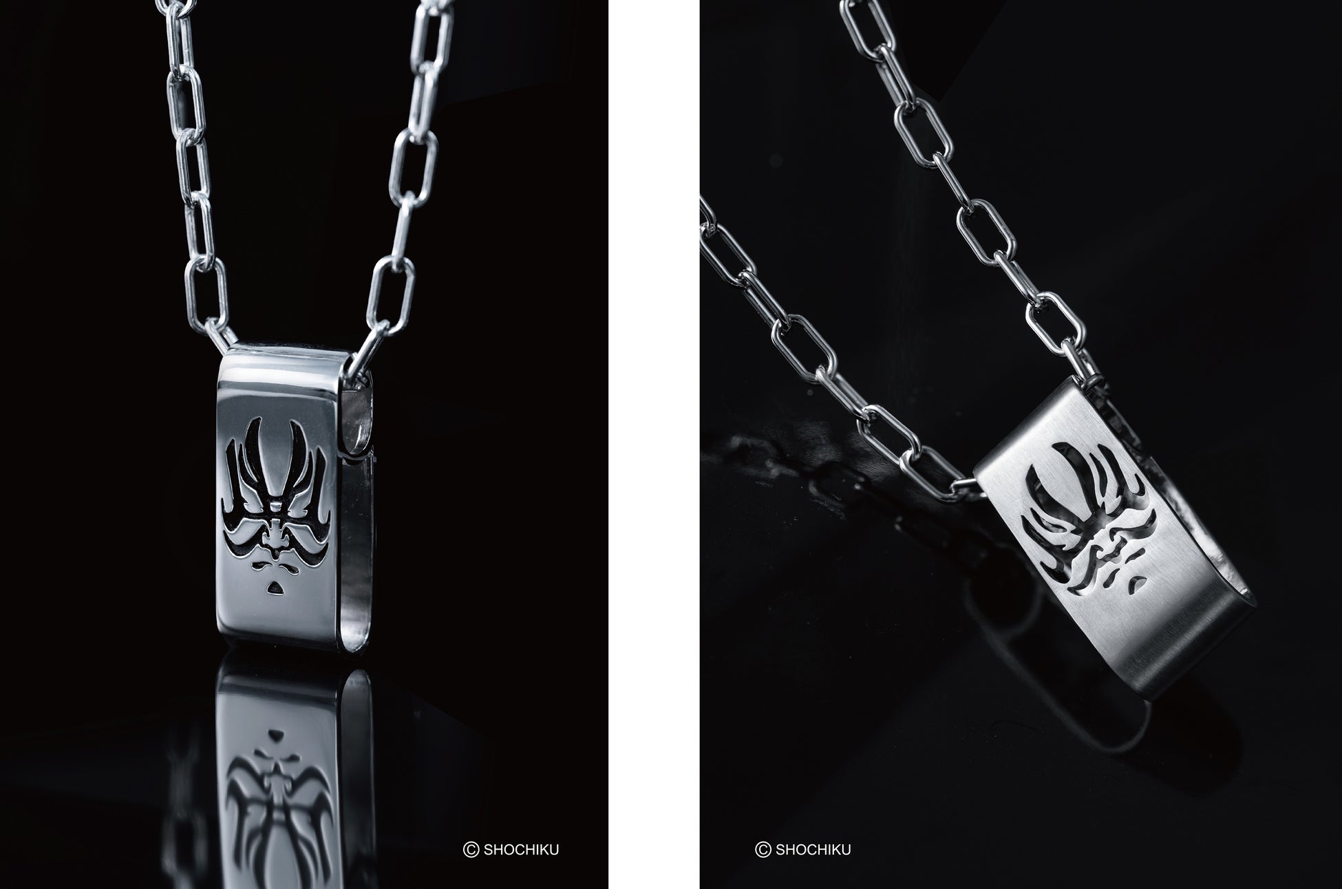 ネックレスは、スクエア型とエッジの効いたダイヤ型の2デザイン。リングも同様に、柔らかな曲線を描くタイプとシャープなシルエットのタイプを展開。それぞれのアイテムには、鏡面仕上げとマット仕上げの2パターンを用意しており、装いに合わせてお選びいただけます。隈取の力強い造形を際立たせながら現代的なエッセンスも加えたデザインで、日本文化を纏うような唯一無二のジュエリーです。