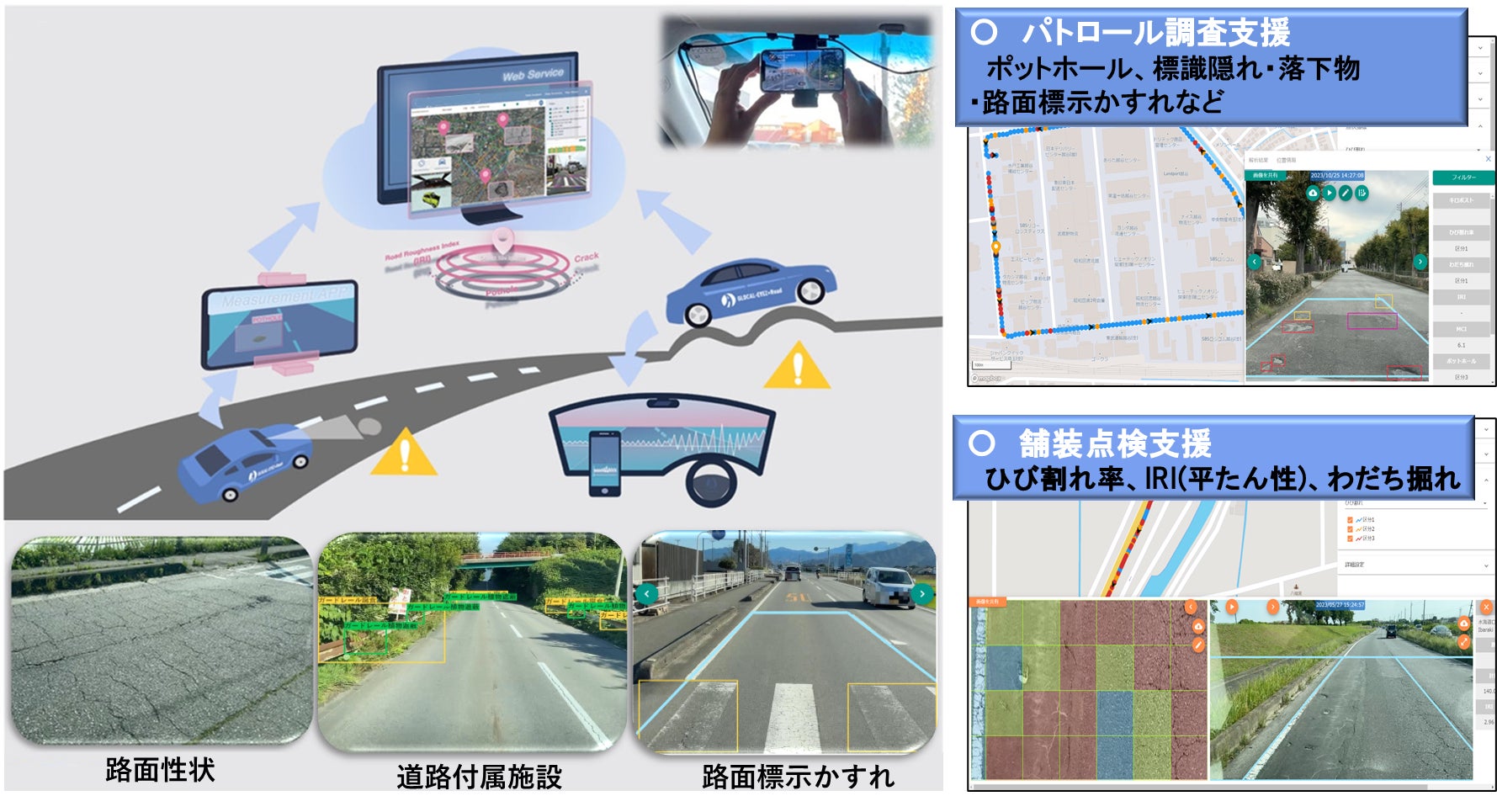 長山智則教授の開発したAIによる路面評価技術の基本ロジックと株式会社スマートシティ技術研究所のAI・システム開発、ニチレキ株式会社の舗装管理・舗装補修技術を融合することにより開発されました。