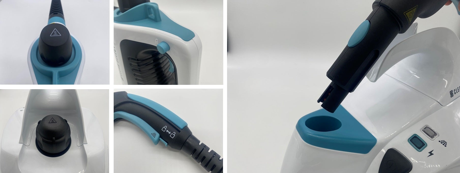 ・ボイラー式を採用しているので、高圧高温スチームを吐出するためホースが途中外れてしまうとケガや火傷など事故の原因になります。キャニスタースチーム(CSC-120)はフレキシブルホースを外せない形状にし、ホースの取り回しがしやすいように、ハンドルに収納スペースを設けています。