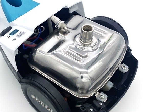 本製品はイタリアのデザイナーが手掛けており、家庭における景観を損ねない、「白」と「スカイブルー」を配色した清潔感が漂うオリジナルデザインとなっております。従来のキャニスター型スチームクリーナーはアルミボイラーを採用していますが、CSC-120はステンレスボイラーを採用。それにより耐久性(耐食・耐熱・保温)を維持しながらも、コンパクトかつ1.2Lの大容量タンク、連続使用時間約30分と十分に能力を発揮できる製品となっております。