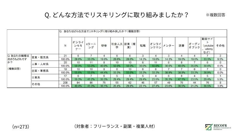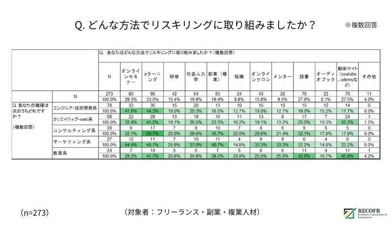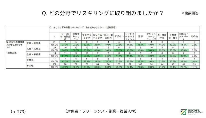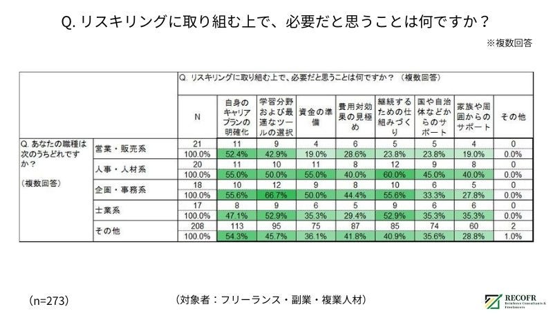 この結果から、どの職種においても、まずは自身のキャリアプランを明確にし、目標を定めた上でリスキリングに取り組むことが大切であると分かります。また当アンケートの対象者でもあるフリーランスや副業(複業)人材は、会社員のように組織的な研修やメンター制度が整備されていないため、自ら学ぶ環境を整え、継続するための仕組みを作ることが重要です。