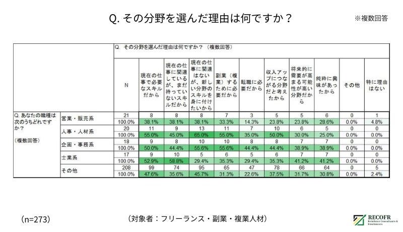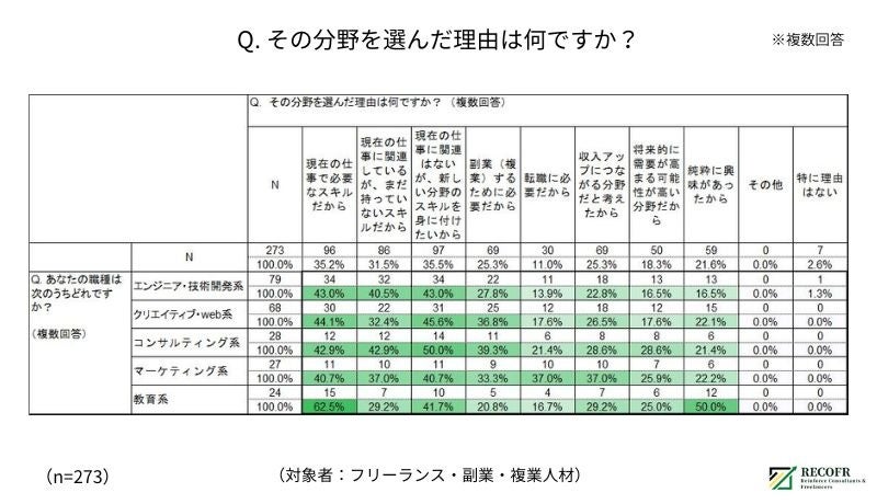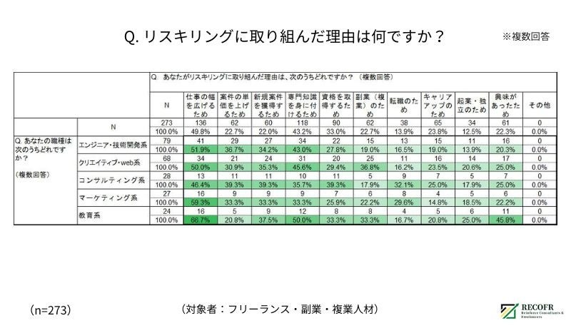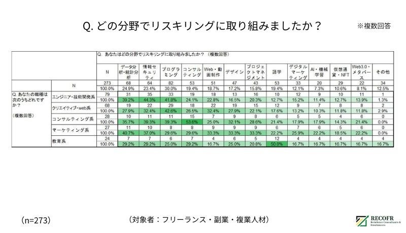 リスキリングに関するアンケートレポート【vol.3:職業別の深掘り】:フリーランス・副業・複業人材でリスキリング実施率が高いのは「エンジニア・技術開発系」。分野選びは職種との親和性を重視