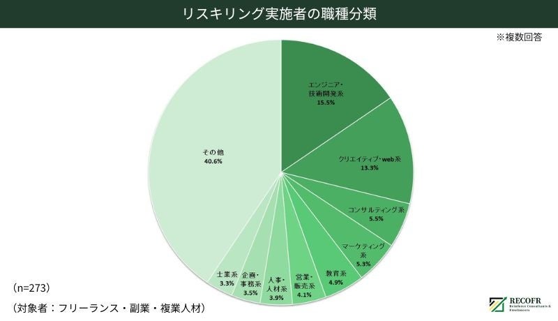「リスキリングに取り組んだことがある」と回答したフリーランス・副業・複業人材のうち、最も多かった職種は「エンジニア・技術開発系(15.5%)」で、次に「クリエイティブ・Web系(13.3%)」が続きました。