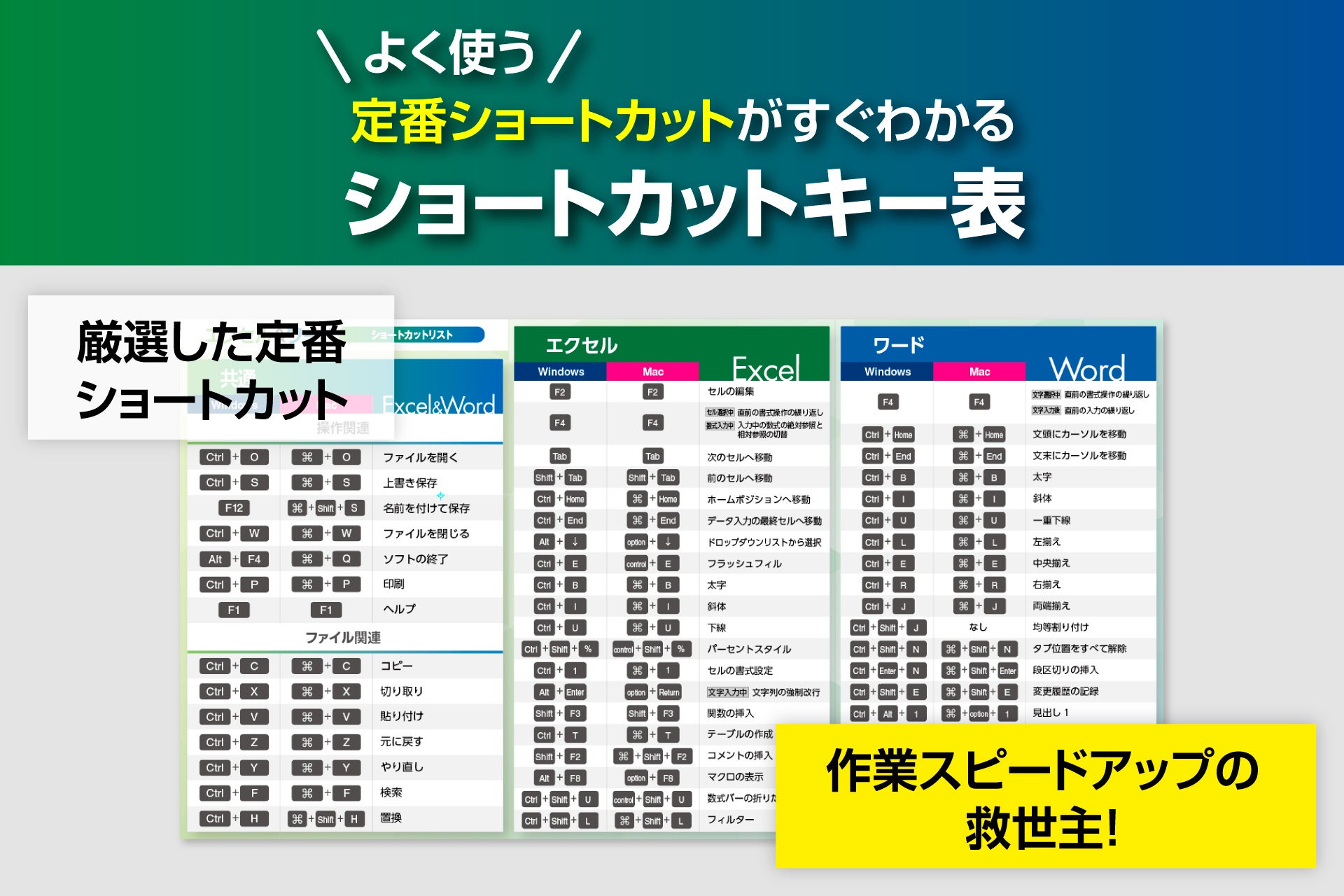 便利で使えるショートカットキーをリストにした一覧表をつけました。