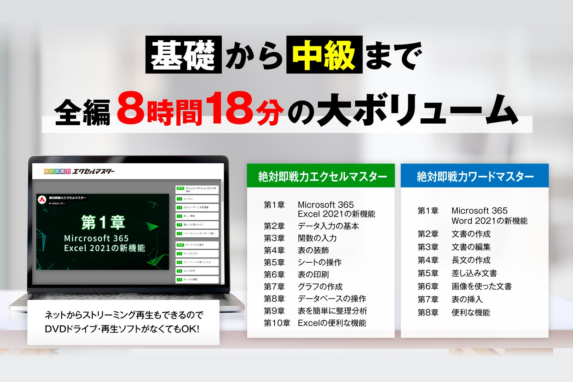 動画は全編8時間18分の大ボリューム。最新OfficeのExcelとWord、入門から中級までをカバーしています。