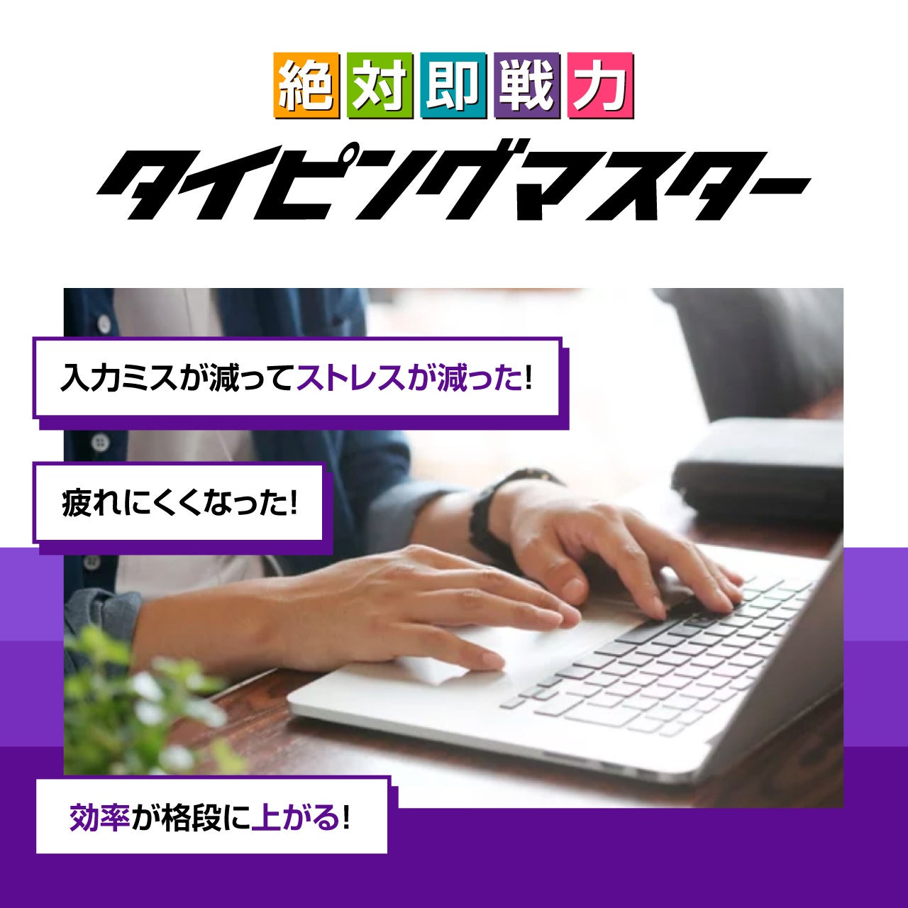 独学のタイピングで困っていないという方でも、正しい知識を持った上で、効果的なタッチタイピング練習を重ねて行くと、確実に作業効率は上がり、今までの数倍の量の作業をこなすことができるようになります。