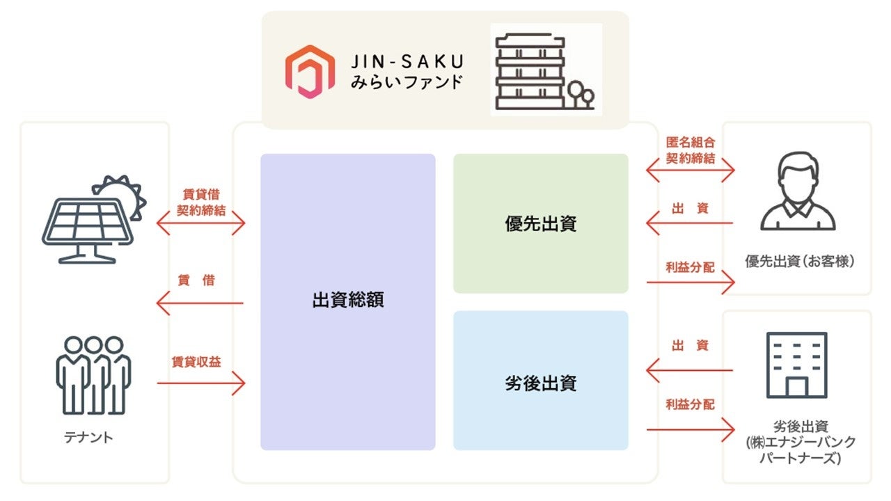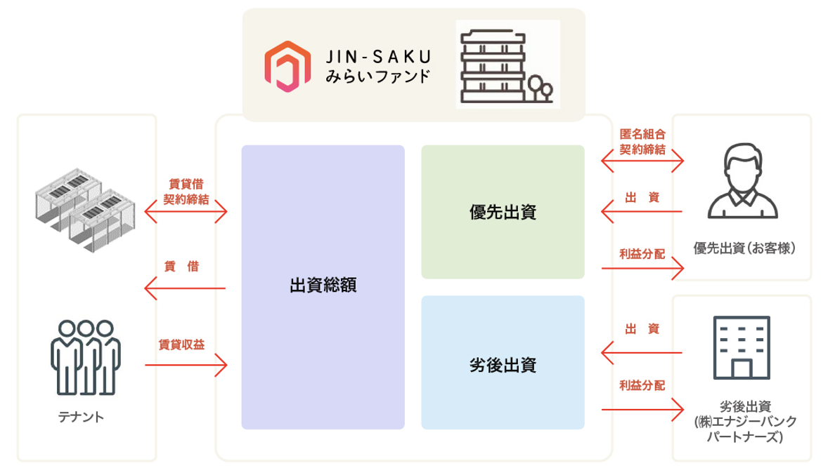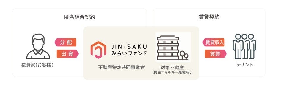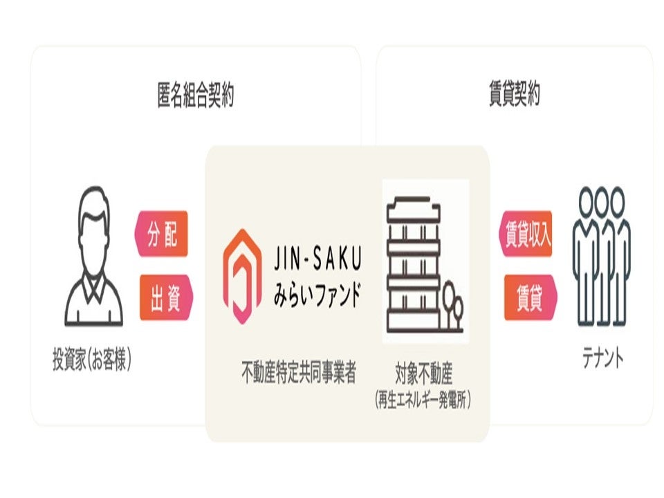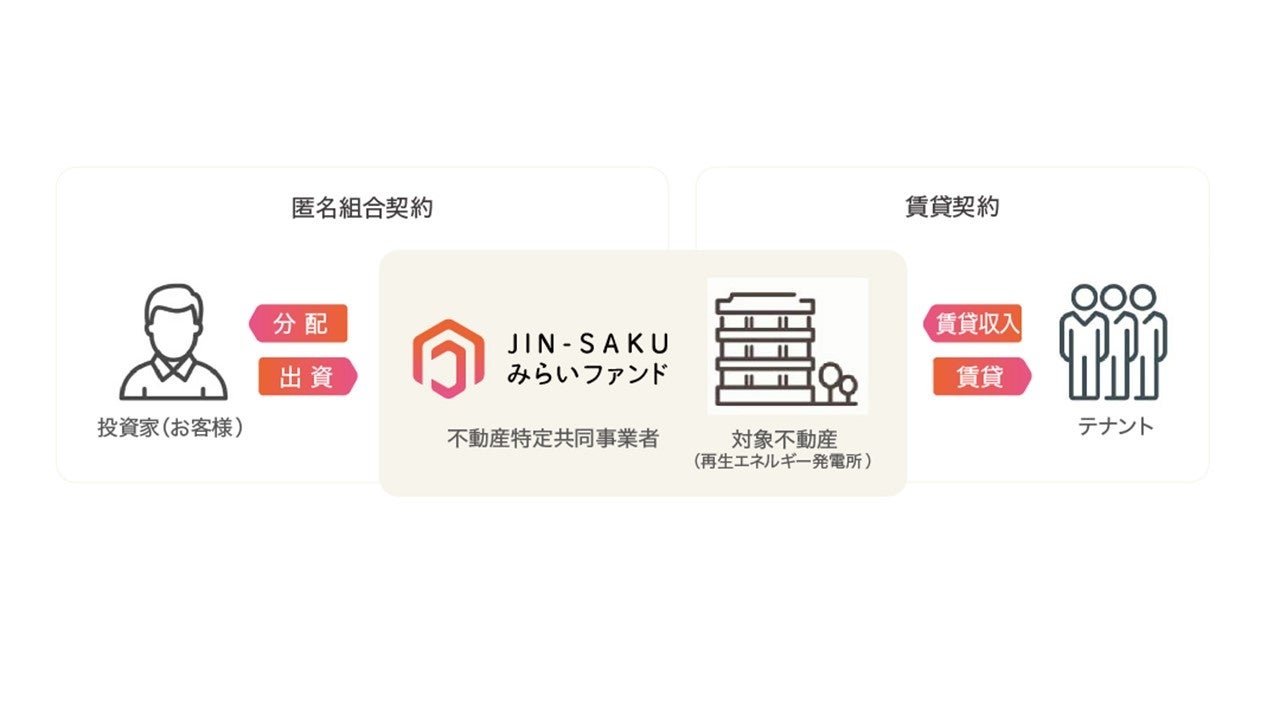 不動産特定共同事業法に基づく不動産投資商品(匿名組合型)の「JIN-SAKUみらいファンド2号」は1口10万円から投資ができ、初めて投資する方にもおすすめです。複数の投資家様(以下「お客様」という。)から出資を募り、その資金を以てJIN-SAKUみらいファンドが不動産を取得し、その賃料収入で得た利益を出資額に応じて分配するシステムです。お客様とJIN-SAKUみらいファンド間においては匿名組合契約を締結し、金銭の出資と利益の分配を約します。