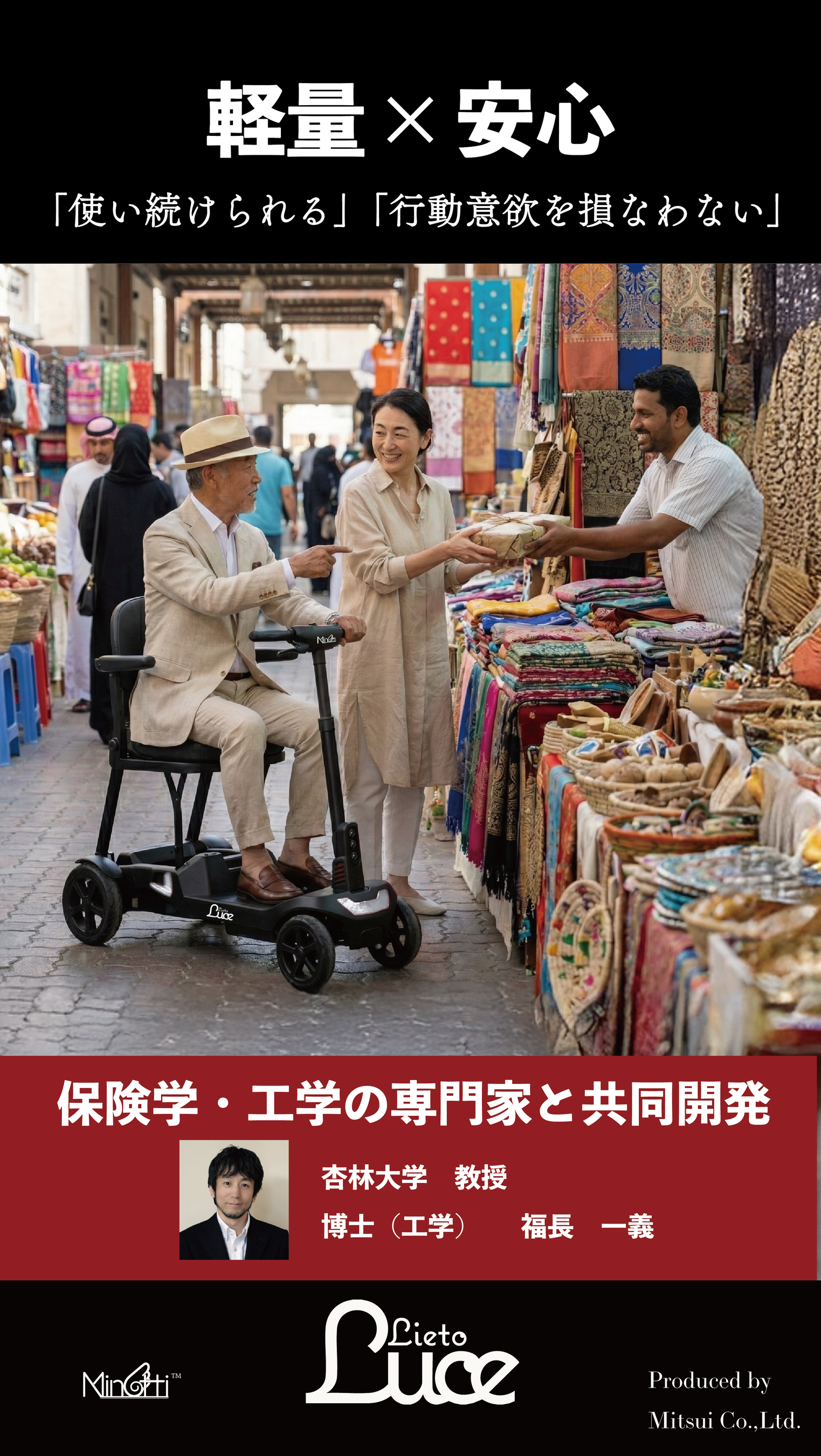 ■ 福長教授コメント: 「高齢期において、自分の力で移動できることは健康寿命を支える重要なモチベーションです。今回開発した『リエート・ルーチェ』において、軽量であることは単に出し入れが楽なだけではありません。車体が軽いほど慣性の影響が小さく、止まりたい時に止まりやすく、誤操作時のリスクも低減されます。『軽さ×安心』こそが、行動意欲を損なわない鍵なのです」