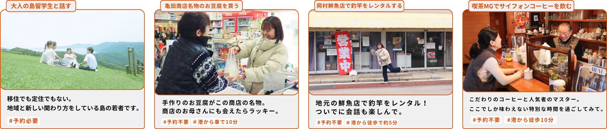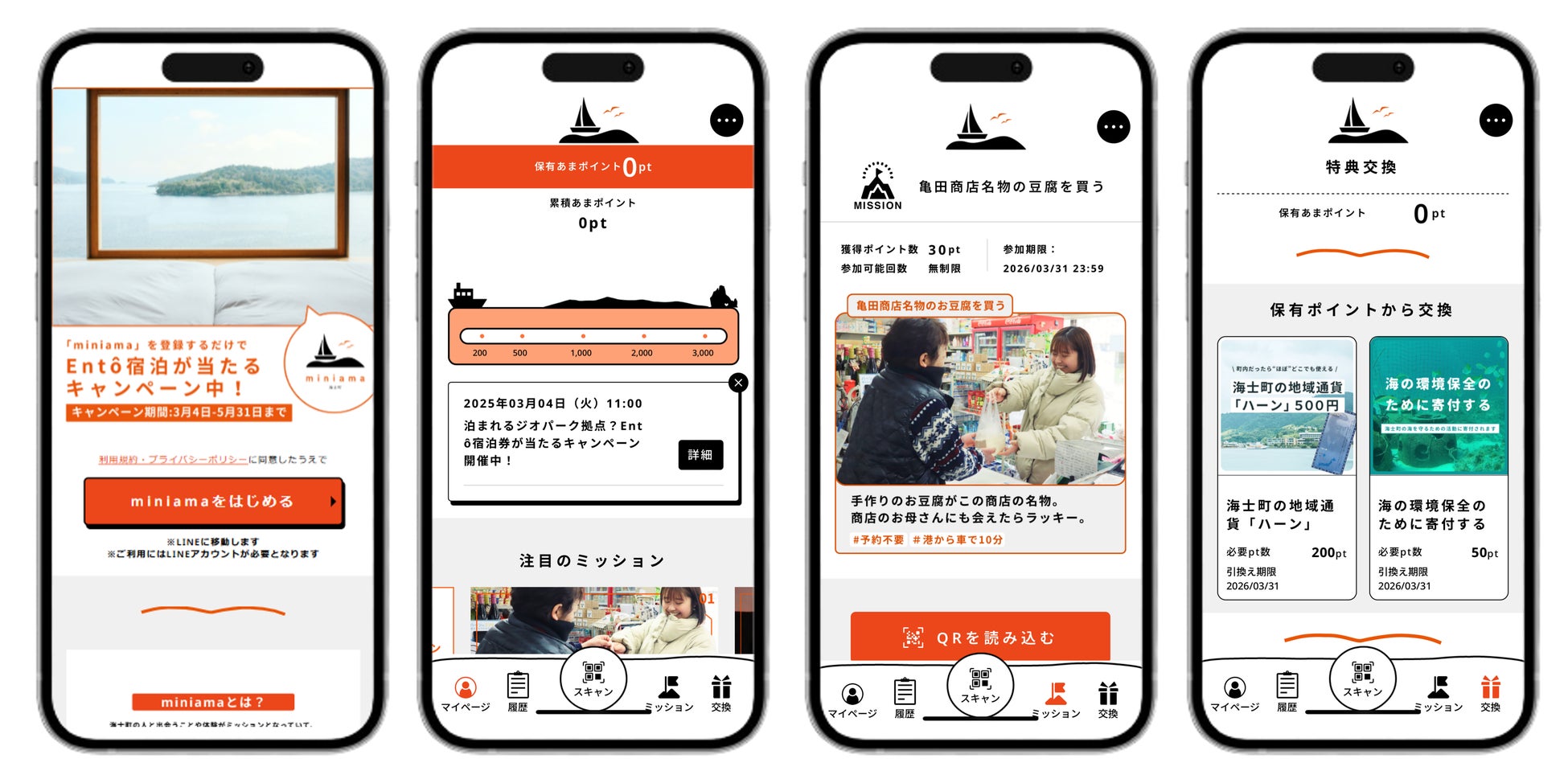 『miniama』内のミッションは、海士町に実際に来島することで参加できるものになっています。「亀田商店で豆腐を買う」 や「岡村鮮魚店で釣竿をレンタルする」など、住民同士のつながりの深い海士町ならではのミッションを設計し、楽しみながら自然とその土地の文化や歴史に触れ、ファンになっていく仕組みを作りました。