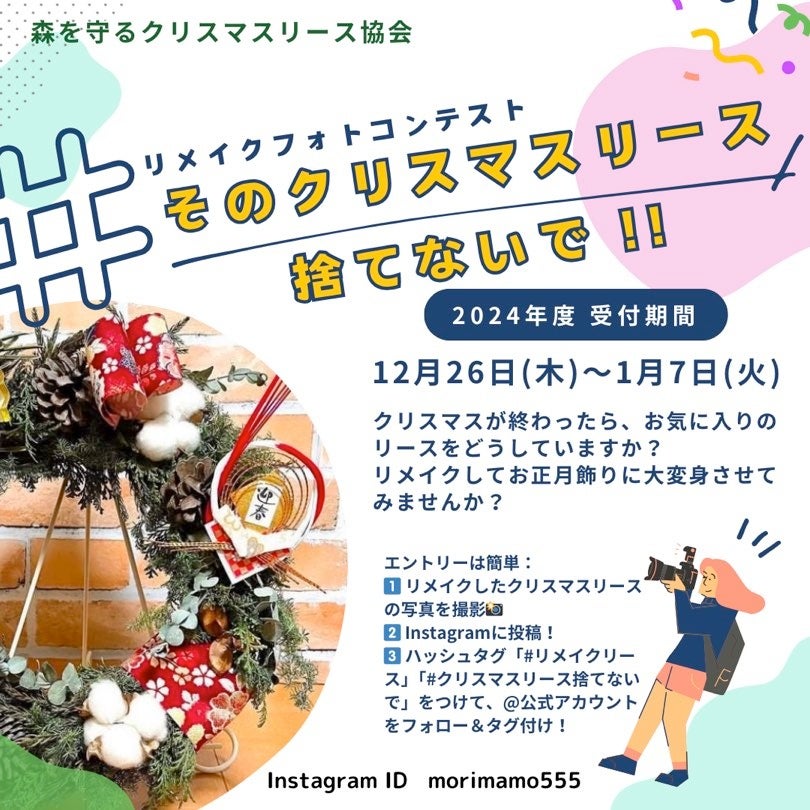 一般社団法人森を守るクリスマスリース協会(代表理事:恒吉牧子、所在地:静岡県静岡市駿河区中田3-2-13)は、2024年12月26日(木)から2025年1月7日(火)まで、Instagramにて”クリスマスリースをお正月飾りにリメイクした写真”をテーマに、フォトコンテストを開催します。フォトコンテストのタイトルは「そのクリスマスリース捨てないで!!」です。全国各地で製作されたクリスマスリースが対象で、お正月飾りにリメイクした写真を投稿いただくフォトコンテストになっています。