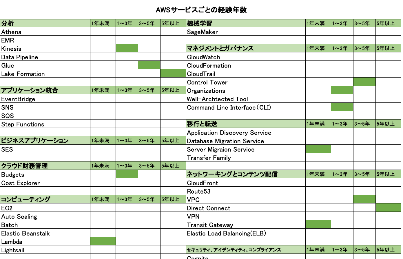 AWS特化のスキルシートは、AWSが展開する主要なAWSサービスをカテゴリーに分けて網羅しており、どのAWSサービスをどれくらいの期間扱ってきたかが一目で分かります。このことでエンジニアの持つスキルの伝え漏れや双方の認識齟齬が生じるのを防ぐことができます。