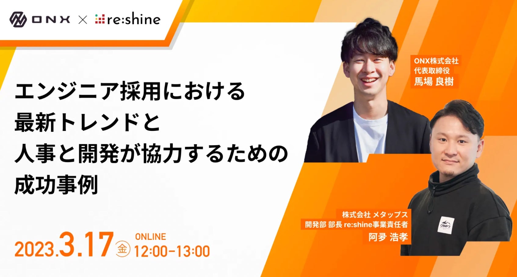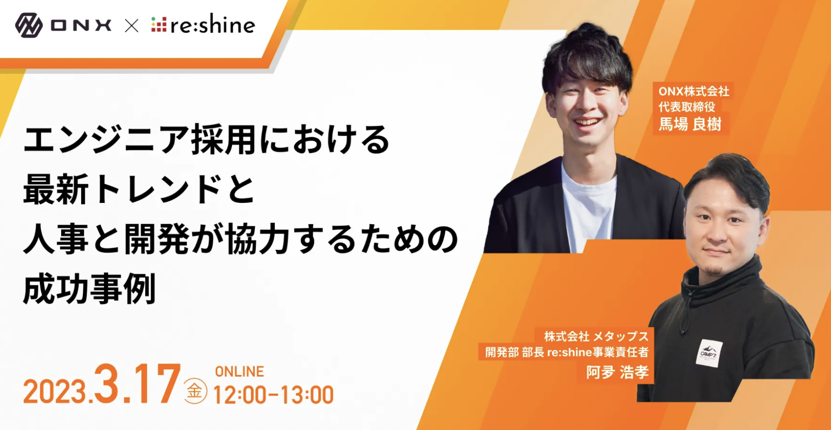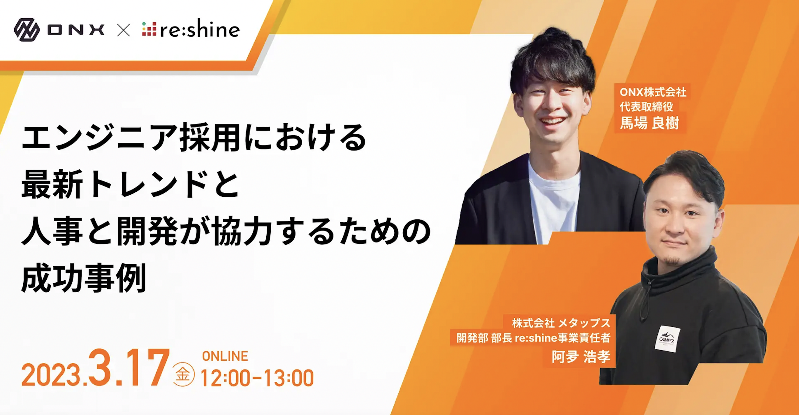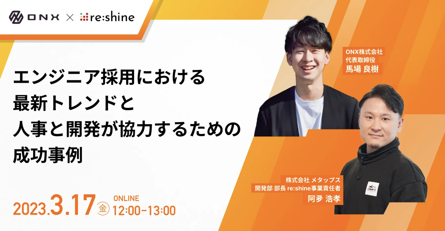 本セミナーでは、即戦力人事の紹介サービス「Carry Up」を運営するONX株式会社とIT人材に特化した採用支援サービス「re:shine」を運営する株式会社メタップスが、エンジニア採用において人事と開発チームの連携方法や、最新の採用トレンドに対応するためのアプローチについて解説します。