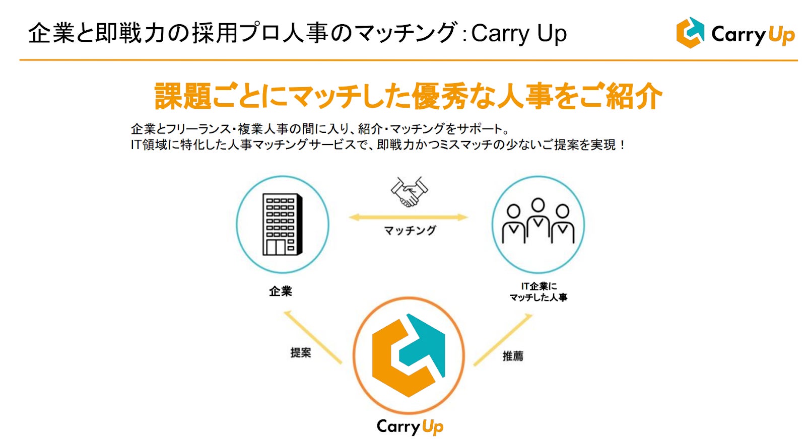 「Carry Up」とは、企業とフリーランス・複業人事の間に入り、マッチングをサポートするサービスです。IT企業の領域に特化しており、即戦力かつミスマッチの少ない人材を提案することができます。