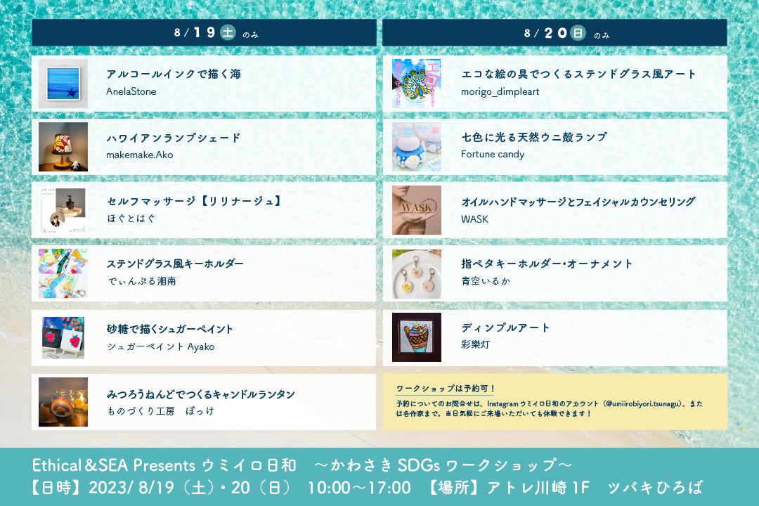 地球にやさしいイベント_かわさきSDGsワークショップ「Ethical&SEA Presents 【ウミイロ⽇和】」2023年8⽉19⽇(⼟)・20⽇(⽇)開催