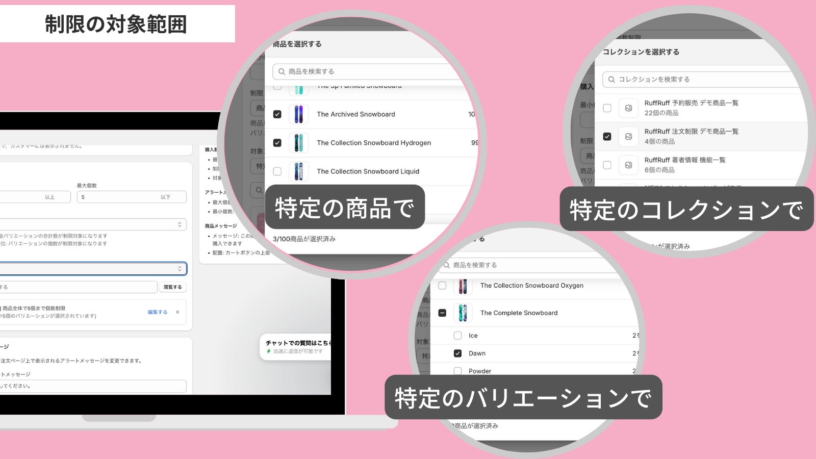 販売個数制限を実施する対象とする商品は、「特定の商品」や「特定のバリエーション」、「特定コレクション」から選択が可能です。