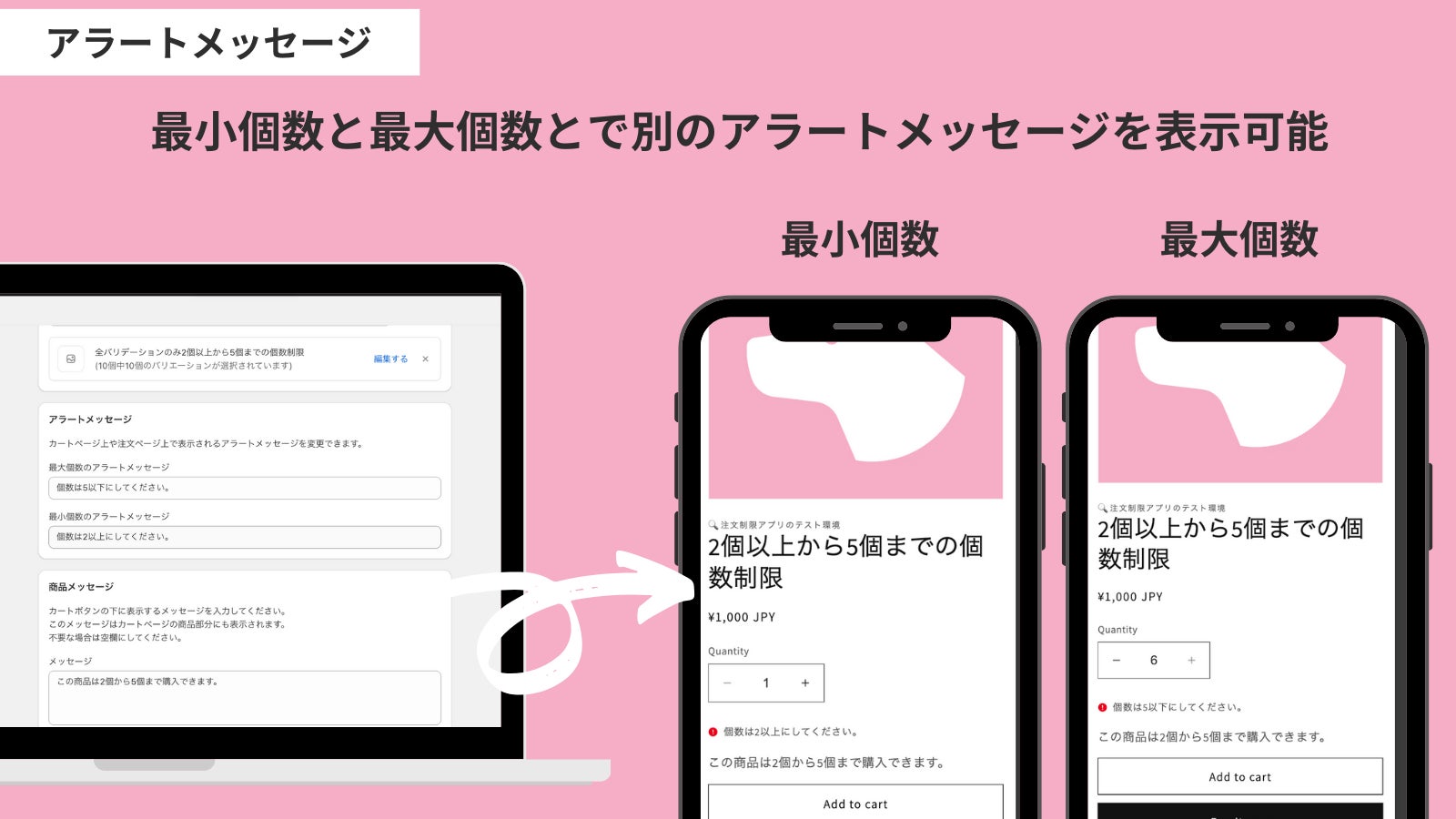 お客様が設定した個数条件外の購入を試みた際は、アラートメッセージを表示し注文を防ぎます。個数条件や個数制限の対象範囲、メッセージなどは自由にカスタマイズ可能です。