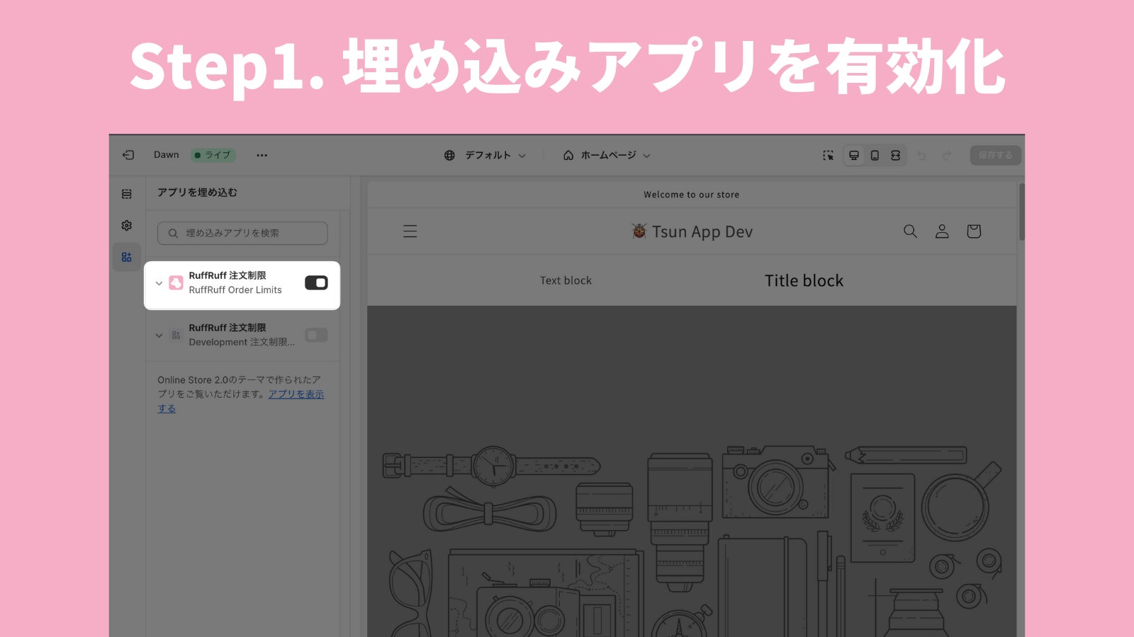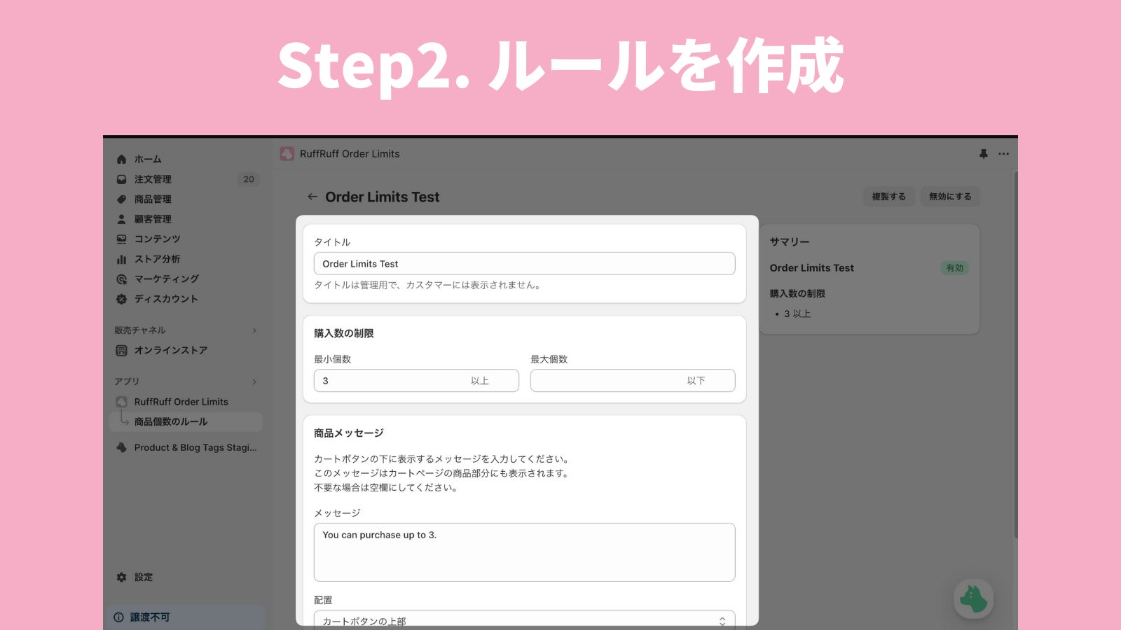 セットアップはたった2ステップで、「埋め込みアプリを有効化」し、「販売個数制限のルールを作成」だけです。セットアップにプログラミング知識も一切不要です。