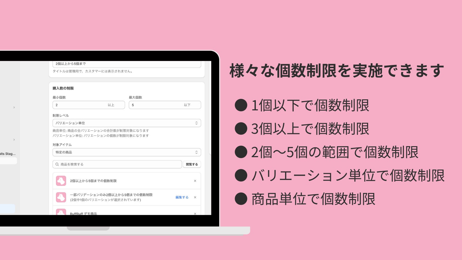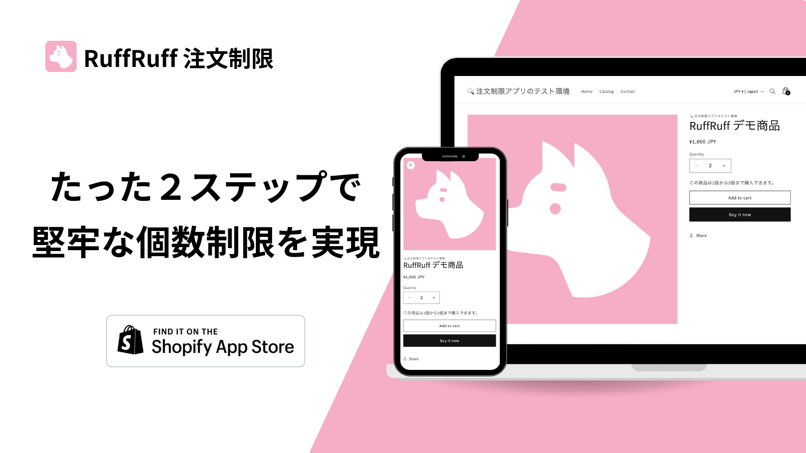 『RuffRuff 注文制限』はノーコードかつ2ステップの簡単セットアップで、販売個数の制限ができるShopifyアプリです。