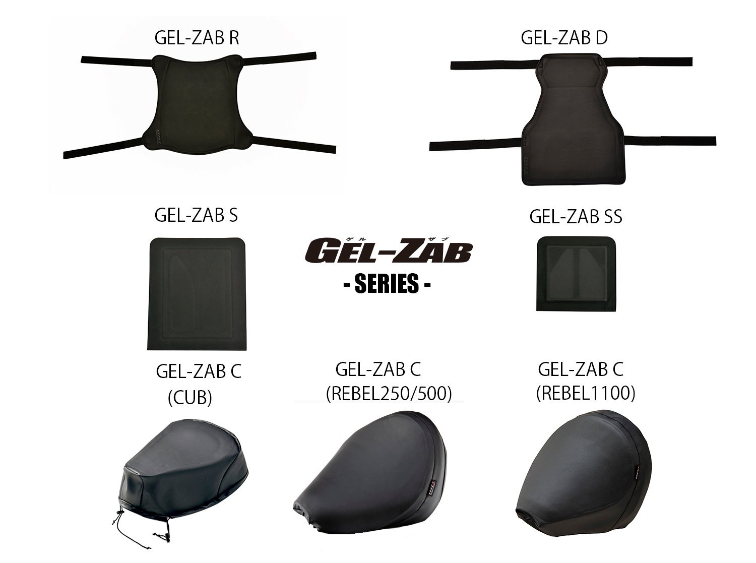 インナータイプの2種)として発売しました。現在はよりフィット性と外観のデザイン性を考慮しゲルザブR(最新のスポーツモデルにも対応)へ進化。また、ゲルザブD(オフロードモデル用)、ゲルザブC(車種専用カバータイプ)、ゲルザブS/SS(シートインナータイプ)へバリエーションを増やし、累計販売数も13万枚を超えバイクツーリングでお尻の痛みを抱えているユーザーにお使いいただいています。
