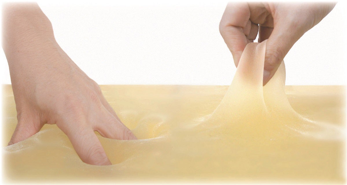 厚さが薄くても十分にクッション性のある素材の発掘、そこで医療用にも用いられるエクスジェルにたどり着きました。この素材は従来のゴム(形状回復性)とゲル(流動性)を併せ持つ特殊柔軟ゴムです。ウレタンフォーム等に比べて5~10倍の衝撃吸収力を持ち、荷重によってゆっくり沈んで包み込み、ゆっくりゆっくり回復します。これによりお尻にかかる圧力を分散させお尻の痛みの原因である血流を改善します。さらにエクスジェルは車体からの微振動をも軽減するので、同時に快適性をも向上させることができます。また、ゲルのみだとグニュグニュとした座り心地になるため、数千キロに及ぶ走行テストの結果ウレタンとの配合を決定し適度な固さとクッション性のバランスを考え、バイクライディングに最適な座り心地としております。さらに多くの車種に適合させるためにゲルザブは汎用タイプとし、また取り外して使用することも考え巻き付けタイプと中に入れるインナータイプの2種をラインナップ。